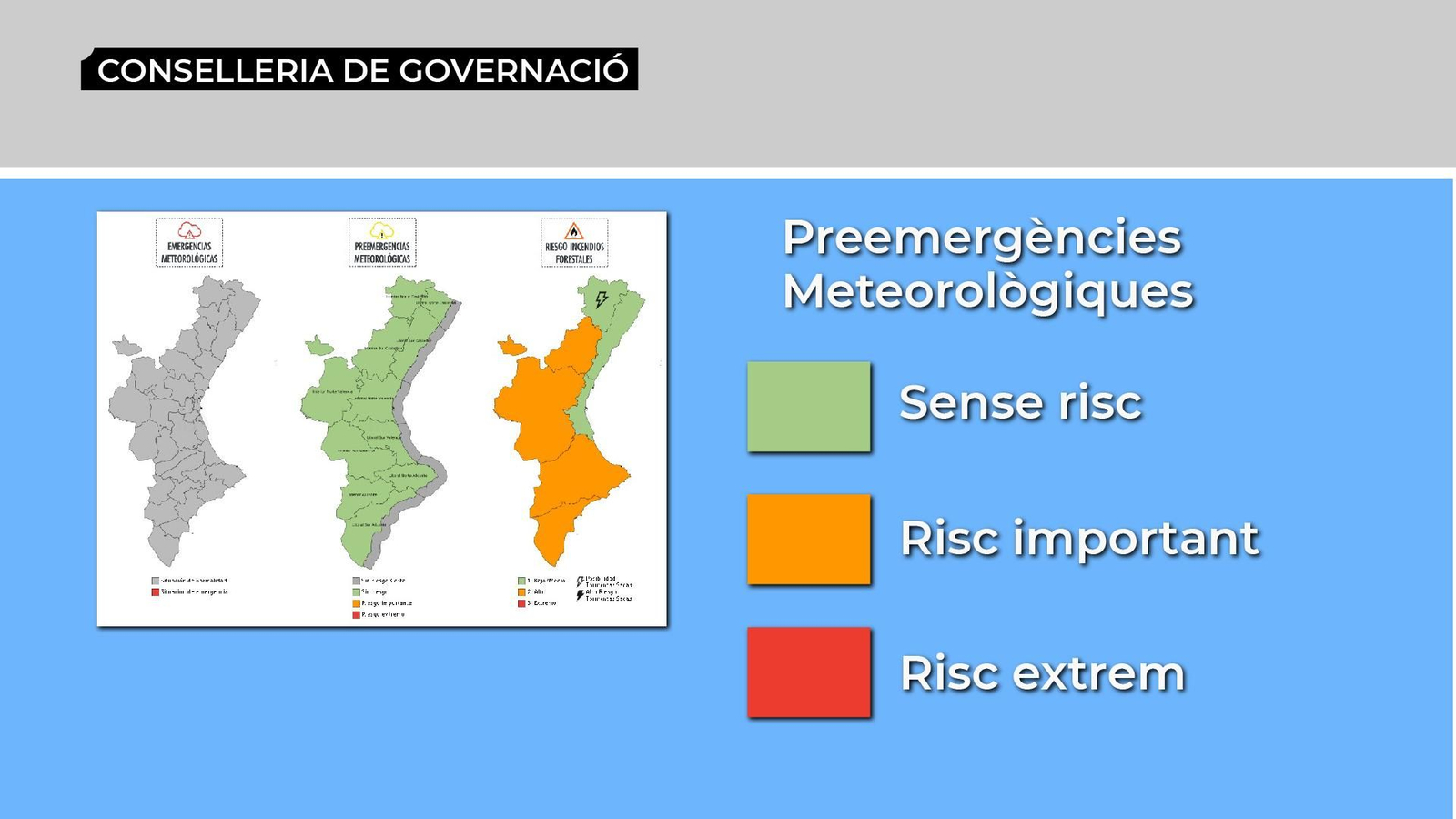 La Conselleria de Governació, a més de les preemergències d’incendis, és la segona font que emet preemergències i emergències meteorològiques, que no coincideixen necessàriament amb les d’Aemet, ja que es basen com les del risc d’incendi, en criteris no estrictament meteorològics, sinó també en altres factors que permeten valorar una situació meteorològica que pot causar problemes, siga per temperatures altes, fred, neu, vent... Tenen tres nivells o colors. Sense risc amb color verd, risc important amb color taronja, i risc extrem amb color roig.