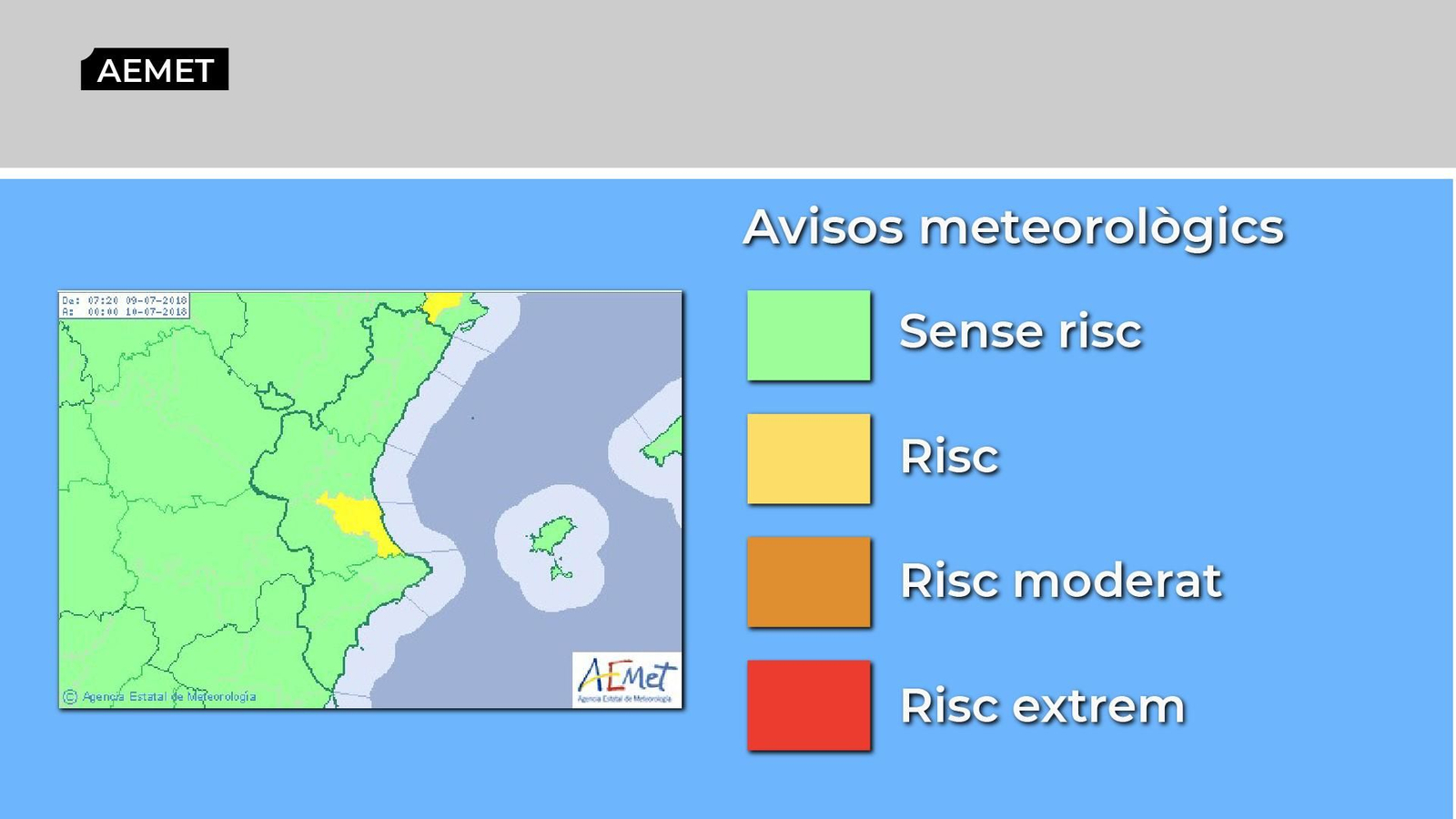 Els avisos de l'Agència Estatal de Meteorologia són els que utilitzem com a referència en les previsions meteorològiques. Són 4 nivells d'alerta, cadascun amb un color. Sense risc (verd), risc baix (groc), risc moderat (taronja) i risc extrem (roig). Els llindars per a cada alerta depenen dels valors mitjans de cada variable en la zona en què efectuem l'alerta: no és el mateix registrar 35 °C a Morella que a Xàtiva.