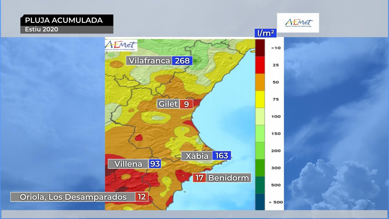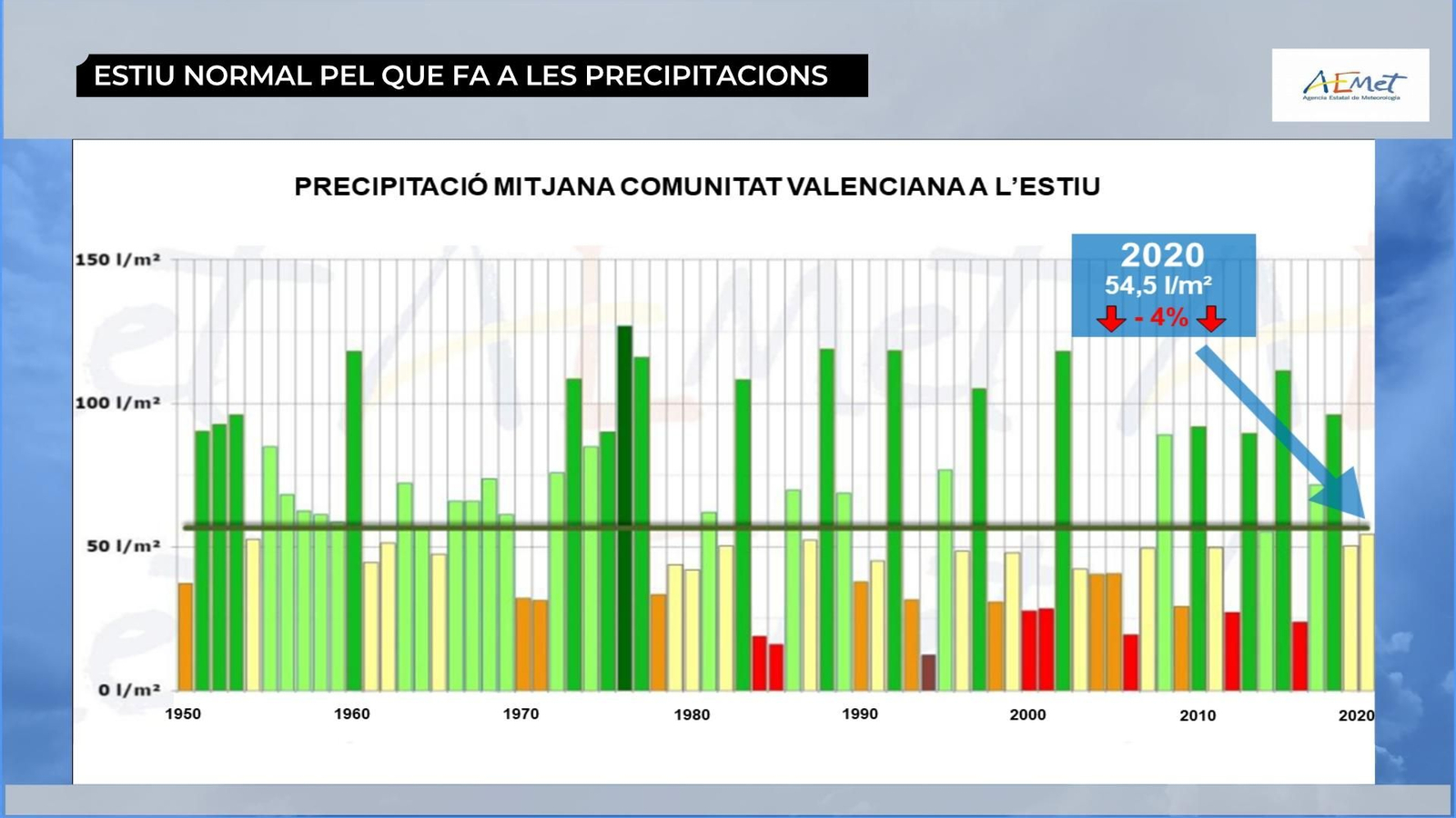 L'AEMET recentment ha fet el balanç de l'estiu meteorològic al territori i ha quedat com un trimestre (juny, juliol i agost) molt càlid, amb una anomalia de les temperatures de 0,6 °C superior a la mitjana i normal pluviomètricament parlant, ja que tan sols ha plogut un 4% menys.