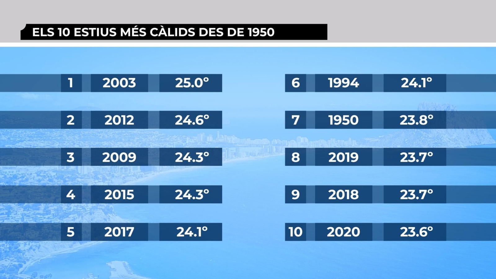 És destacable com dels 10 estius més càlids des de 1950, huit són d'aquest segle, i sis des de 2012. Estem presenciant un augment significatiu en les mitjanes mensuals dels mesos d'estiu, tot i que enguany no hem tingut grans calorades ni ponentades.