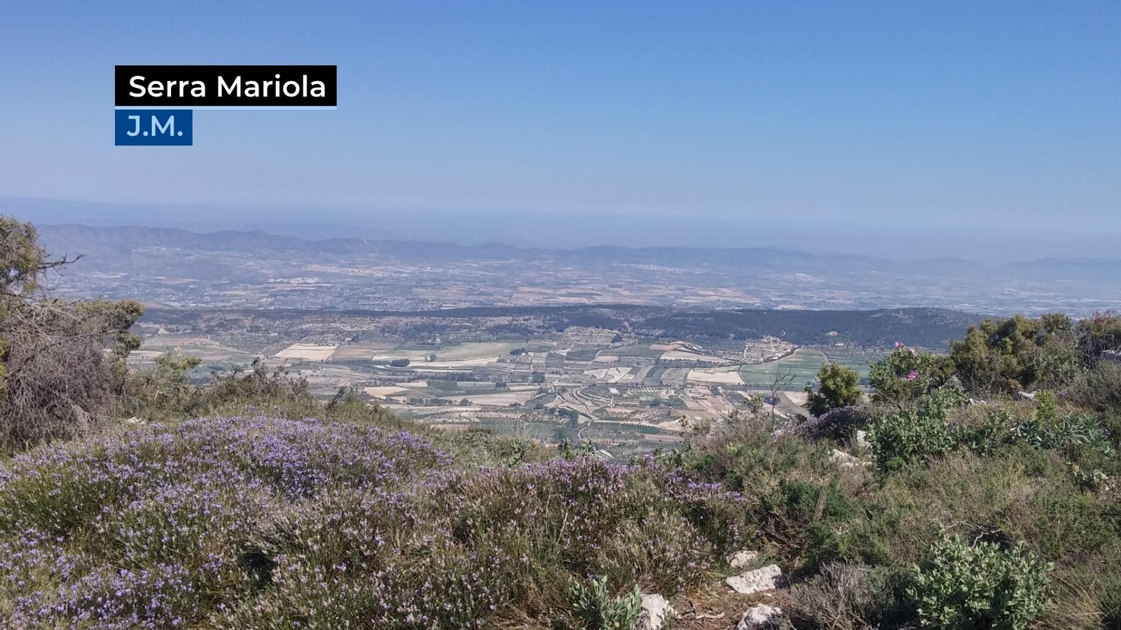 Mirant de la Serra Mariola cap al nord podeu veure la Valleta d'Agres en primer lloc, la Serra de la Filosa darrere i al fons la comarca de la Vall d'Albaida.