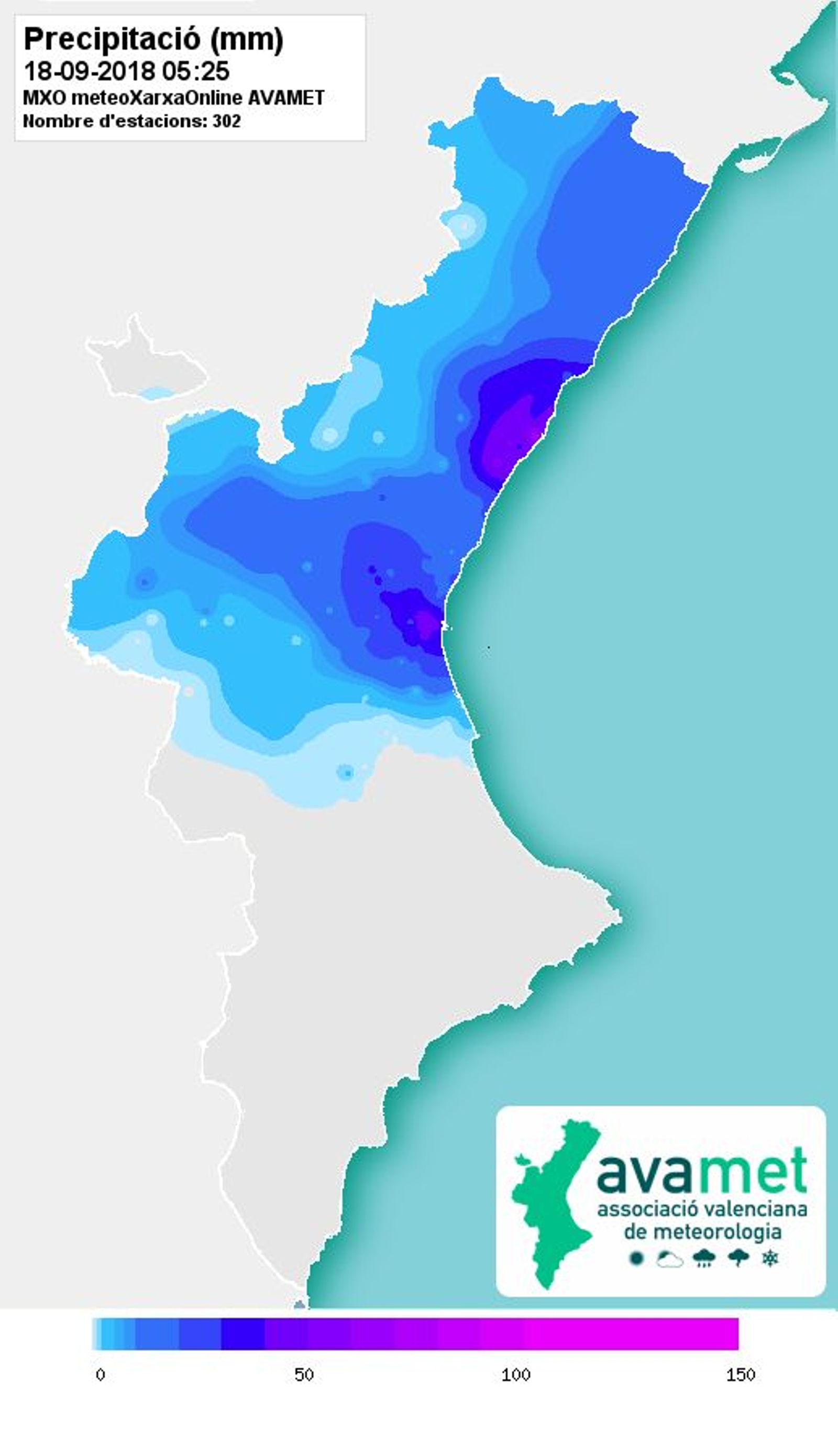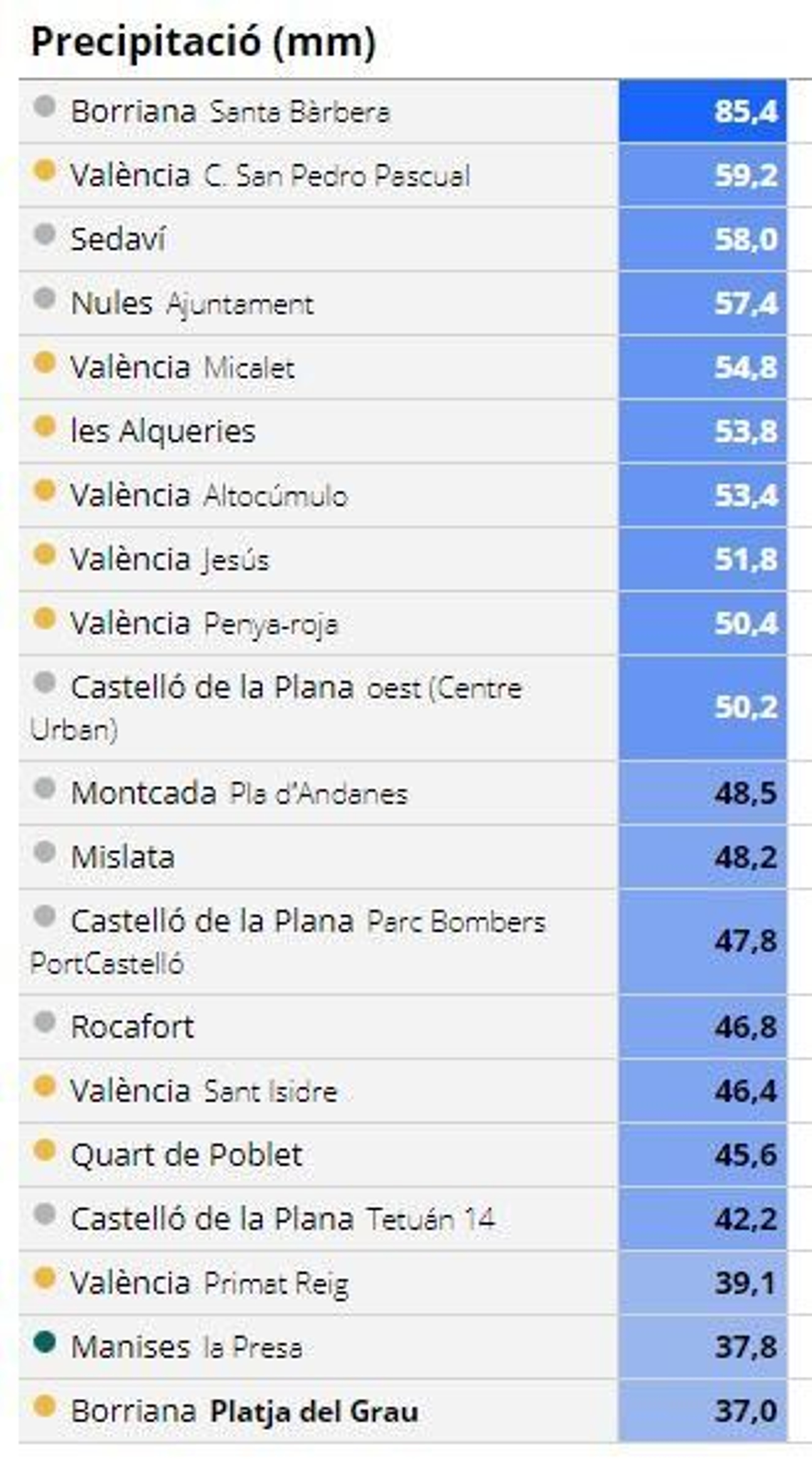 Les quantitats de pluja registrada la matinada de dimarts van ser destacables a la zona metropolitana de València, amb quantitats que van oscil·lar entre els 40 l/m² i els 60 l/m². A la ciutat de Castelló les quantitats es van moure entre els 40 l/m² i els 50 l/m². Destaquen també els 85 l/m² registrats a Borriana, i els 72 l/m² de la Vall d'Uixó, a la Plana Baixa. Cap a Vinaròs es van registrar fins a 48 l/m².