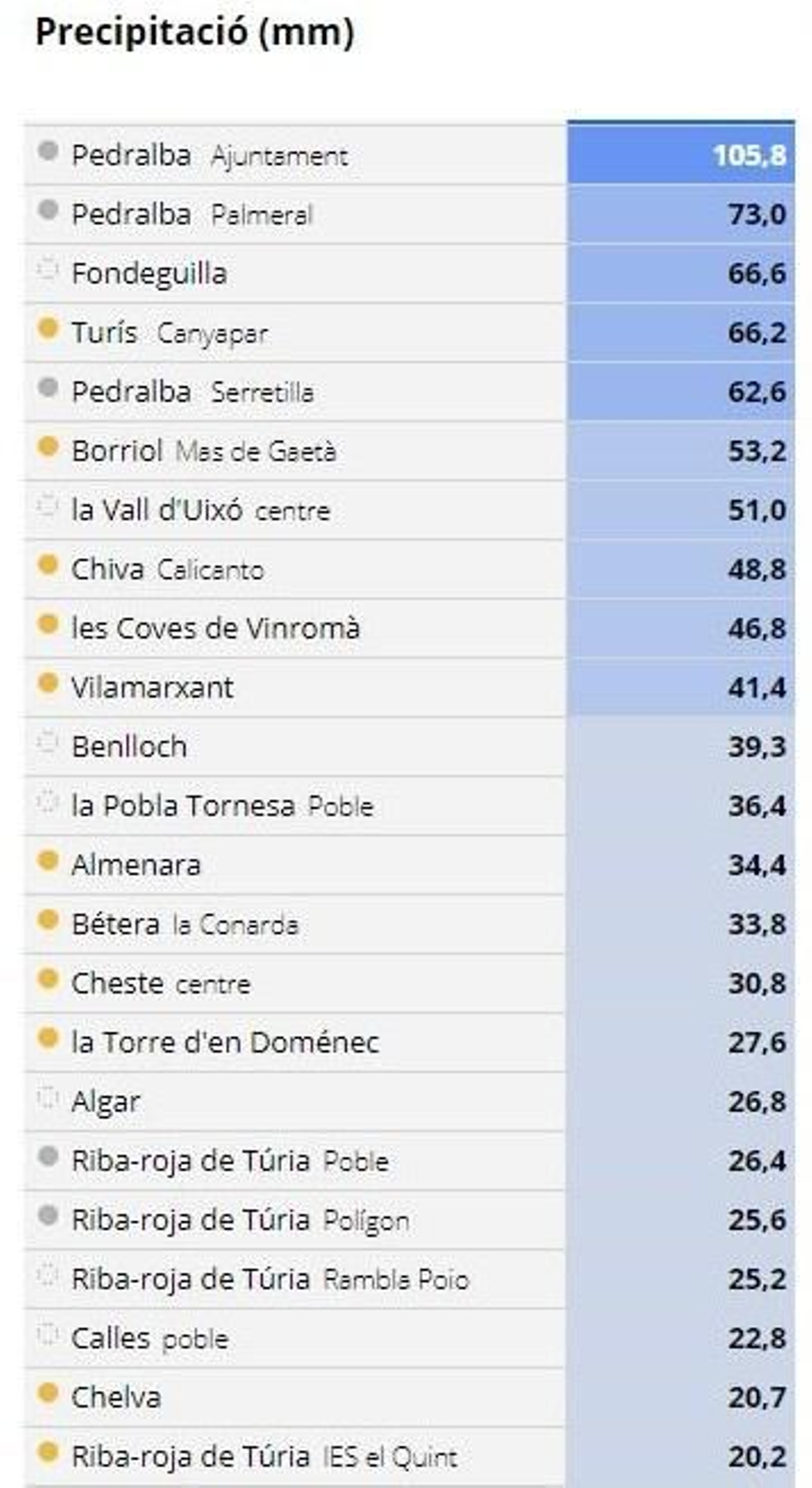 Vegem les dades registrades dilluns i fins a la mitjanit de dimarts. Destaquen els 105 l/m² de Pedralba, als Serrans.