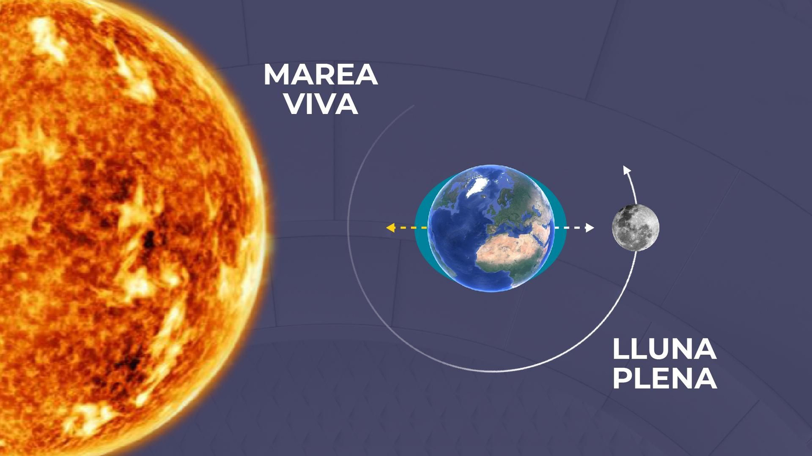 • Amb la lluna plena, la Terra es troba alineada entre el Sol i la Lluna, i per tant la força d'atracció entre els tres astres és màxima. Fruit d'aquesta atracció tenim les anomenades "marees vives".