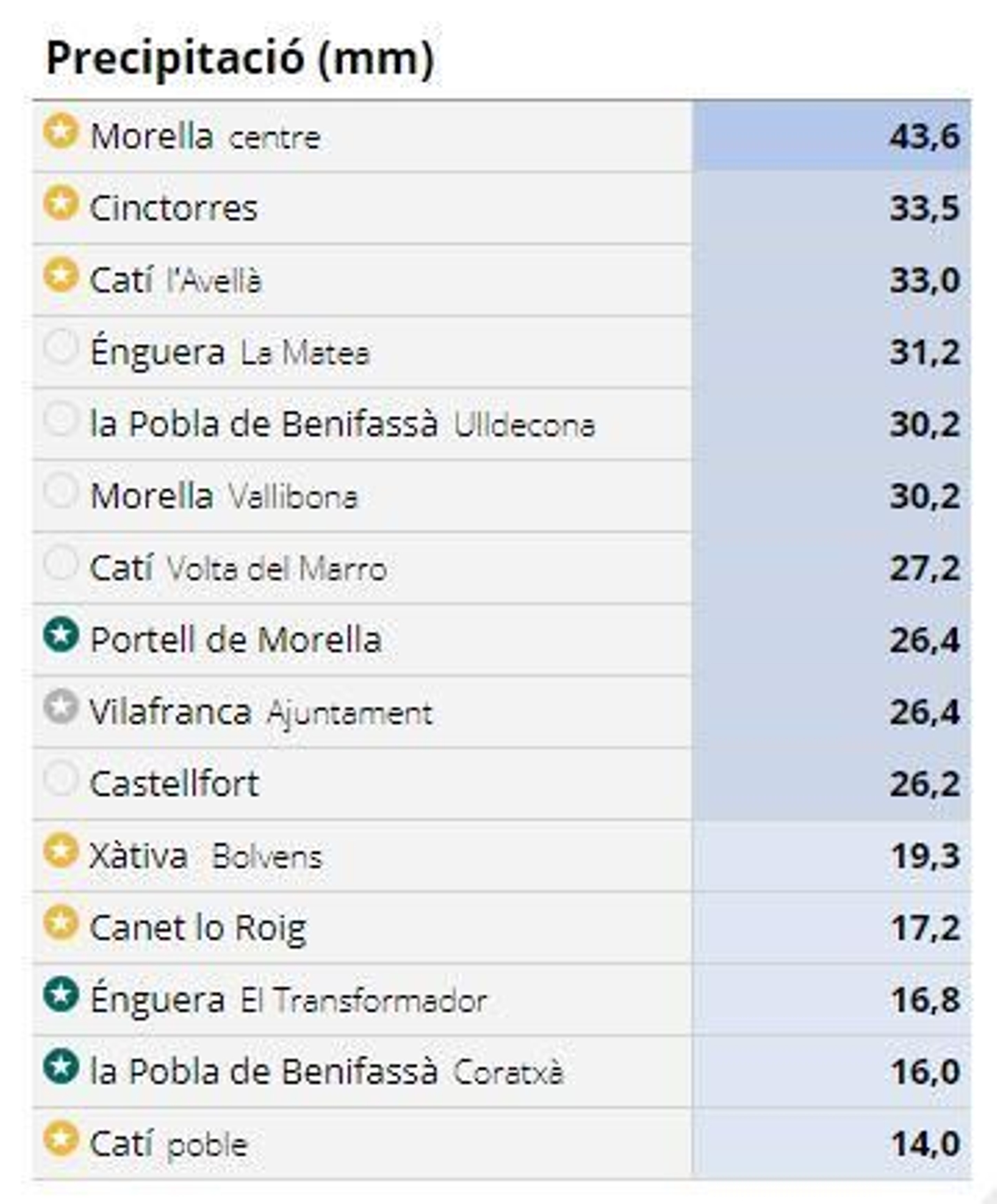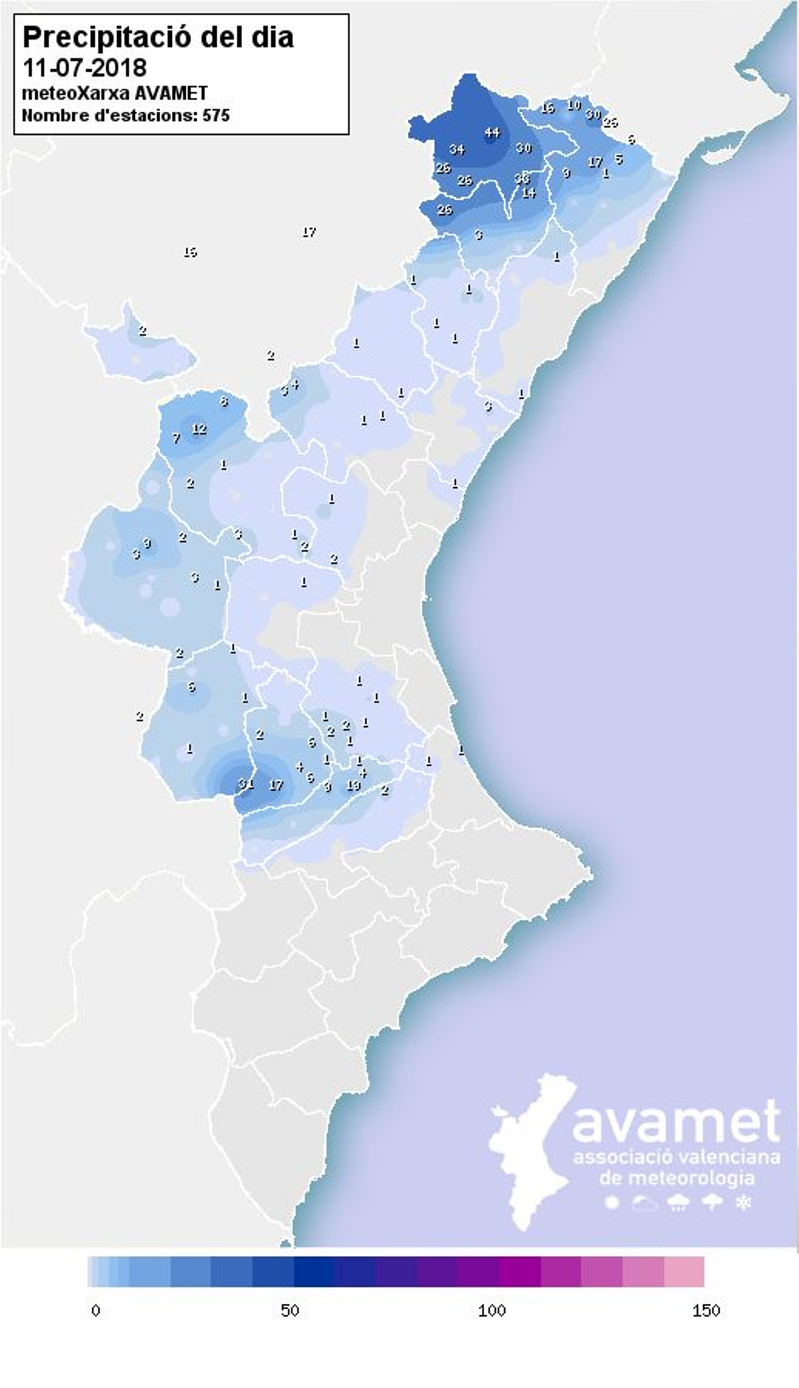 Les quantitats de pluja més importants s'han registrat a l'interior nord de Castelló. Les dades són d'Avamet.