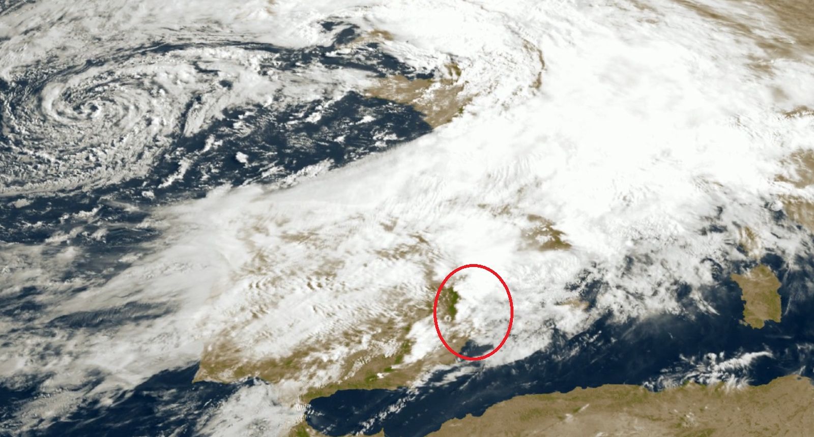 Ací podeu veure com es veuen des del satèl·lit Meteosat, on podem apreciar la zona de formació just a les comarques de l'interior, amb un tall de núvols més definit, i fins i tot, amb el Sol situat cap a l'est, l'ombra dels núvols a la superfície.