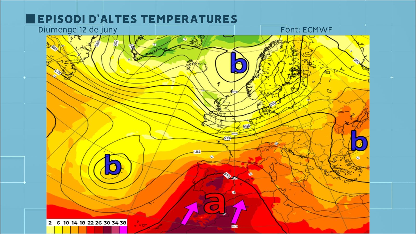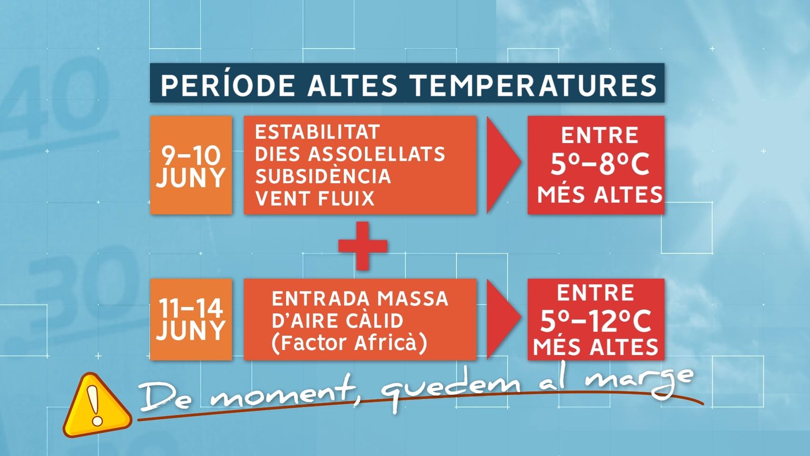 La culpable és una injecció d'aire càlid procedent del nord d'Àfrica a partir de dissabte. Això deixarà temperatures entre 5 i 12 graus per damunt de les que haurien de donar-se ara a principis de juny. A partir del dia 11 hi haurà moltes províncies espanyoles en avís per temperatures elevades, amb valors superiors als 36 a la meitat nord i dels 38 i 40 en punts d'Andalusia, Extremadura i Castella-la Manxa.