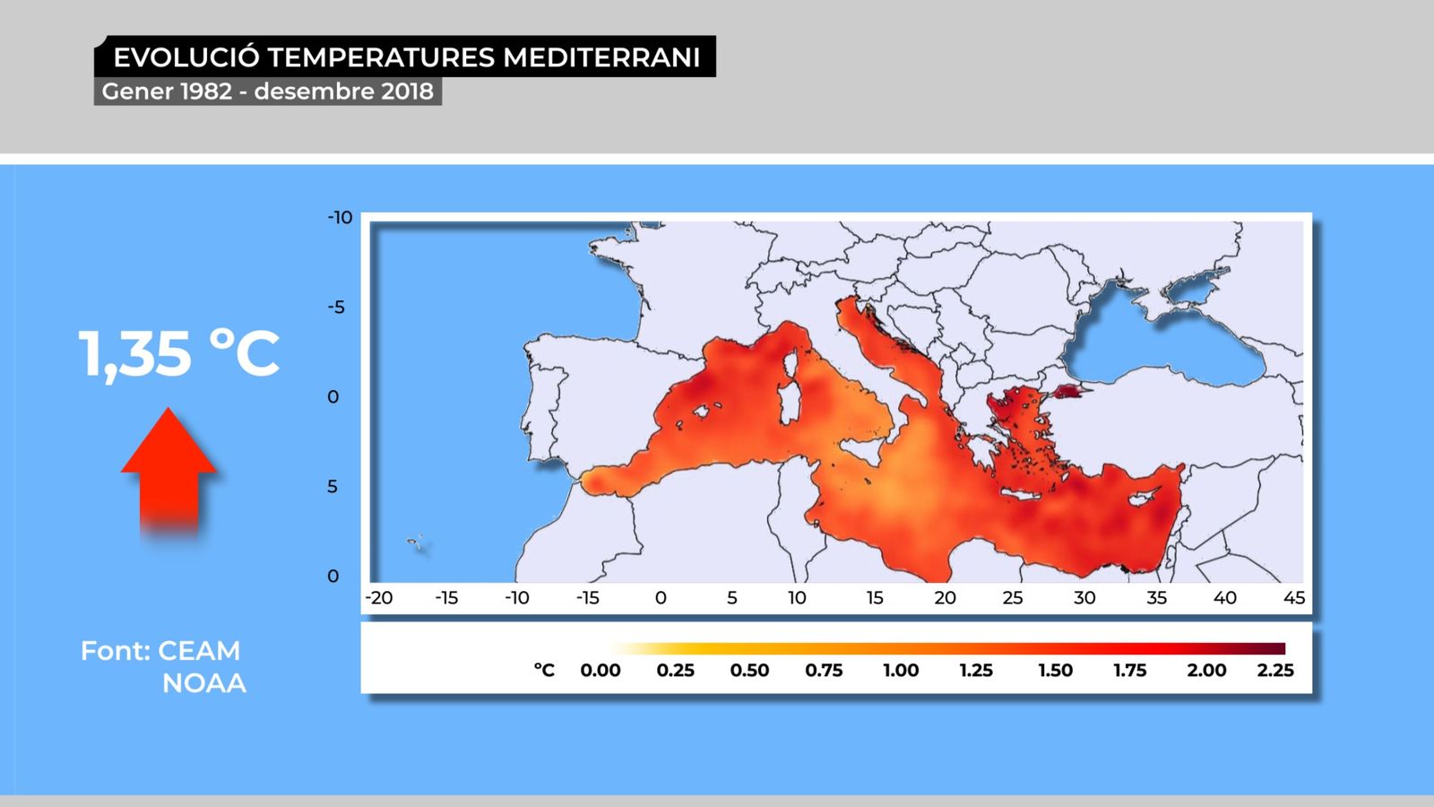 Sense dubte, un del fenòmens més evidents, alhora que preocupants, és l'augment de la temperatura de l'aigua de la mar. De fet, tal com es veu en el mapa següent, des del 1982 fins al 3 de desembre d'enguany, la temperatura del Mediterrani ha pujat 1,35°C. Aquest ascens tèrmic no ha sigut homogeni i s'ha produït un calfament de l'aigua més ràpid al Mediterrani oriental que al central.