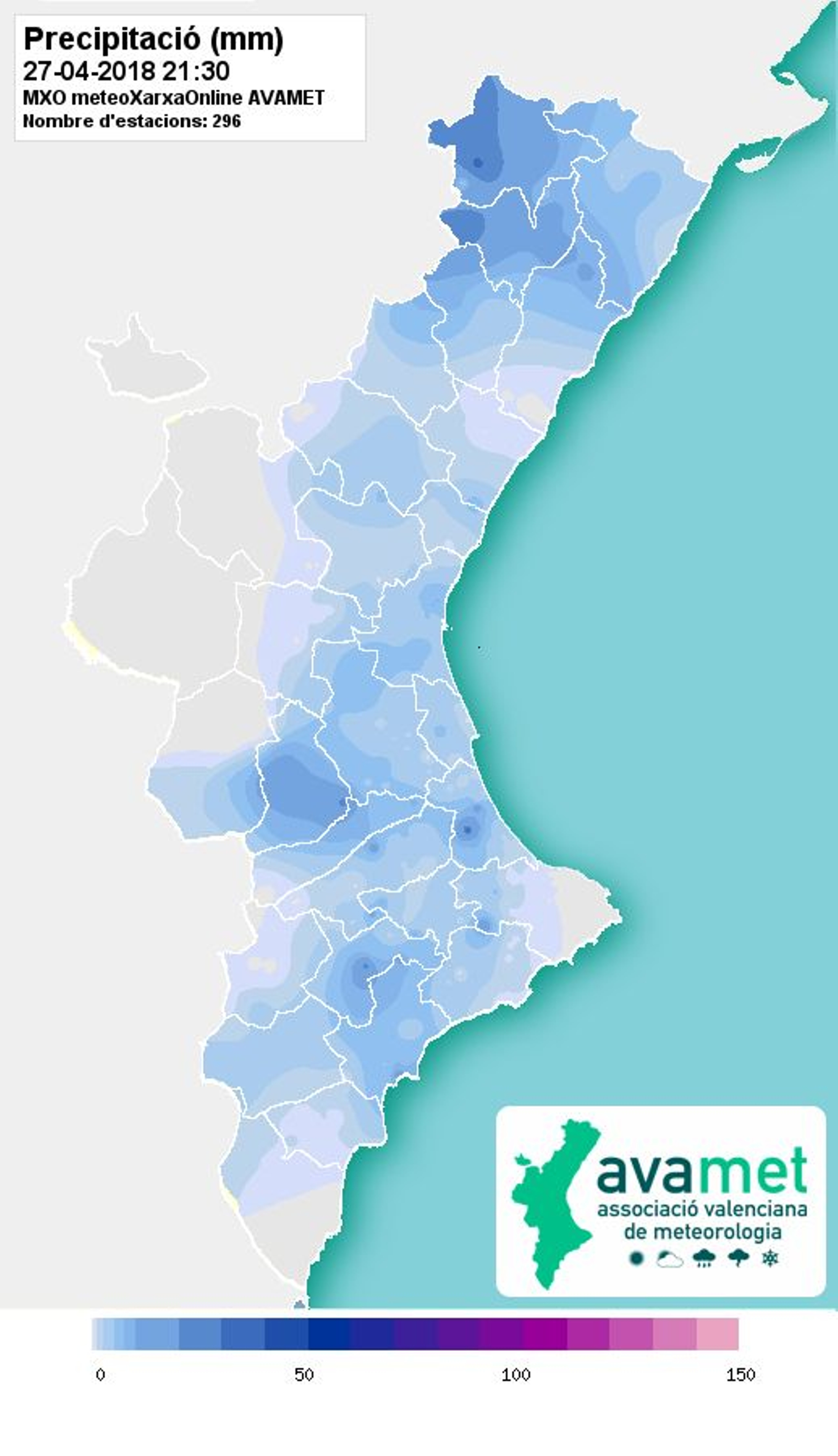 El front que ha recorregut les nostres comarques ha generat fortes tempestes esta vesprada, que han tingut una distribució irregular i que han anat acompanyades de pedra en algun casos. Les pluges més fortes les han registrades als Ports, amb 34 l/m² a Cinctorres; a la Canal de Navarrés, amb 29 l/m² a Anna; a l'Alcoià, amb 28 l/m² a Ibi; i a la Safor, amb 28 l/m² a Gandia.
