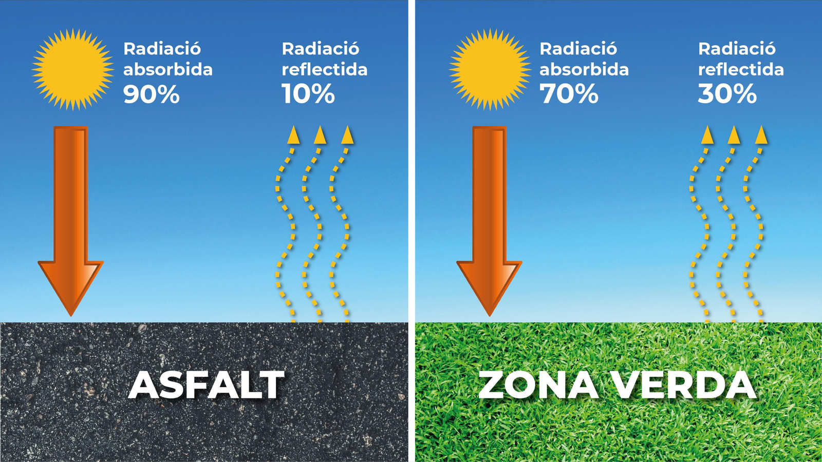 Gràfic: Com més poder reflector tinga una superfície, menys contribuirà a l'escalfament. Podem comprovar en el gràfic anterior que l'asfalt reflecteix menys que les zones verdes, contribuint més, per tant, a l'augment del termòmetre.