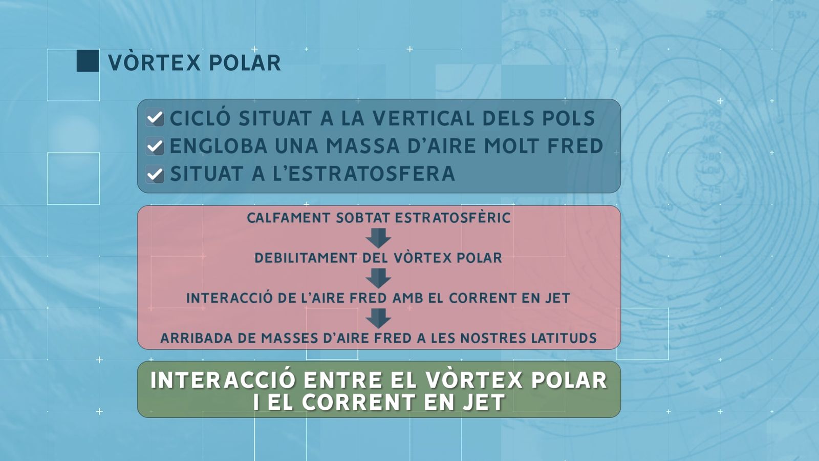 El vòrtex polar és un cicló situat entre l'alta troposfera i l'estratosfera, és a dir, a més de deu quilòmetres d'altura. El més significatiu és que engloba o reté una massa d'aire molt fred, envoltada per vents molt forts que giren en sentit contrari a les agulles del rellotge. Si aquest corrent es debilita, bàsicament per un calfament sobtat estratosfèric, podríem dir que l'aire fred vessa o s'expandeix cap a la troposfera, és a dir, cap a la capa de l'atmosfera més pròxima a la Terra. I a la troposfera interactua amb el corrent en jet. Recordem que el corrent en jet, o jet stream, és un flux d'aire que viatja d'oest a est a uns huit o deu quilòmetres d'altura. Generalment representa la separació entre l'aire fred d'origen àrtic i l'aire més càlid situat més al sud.