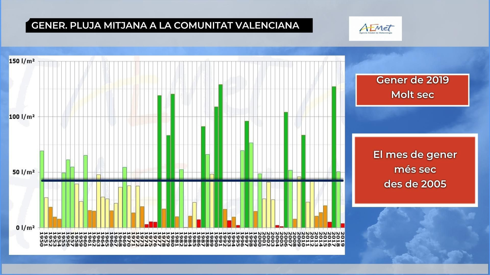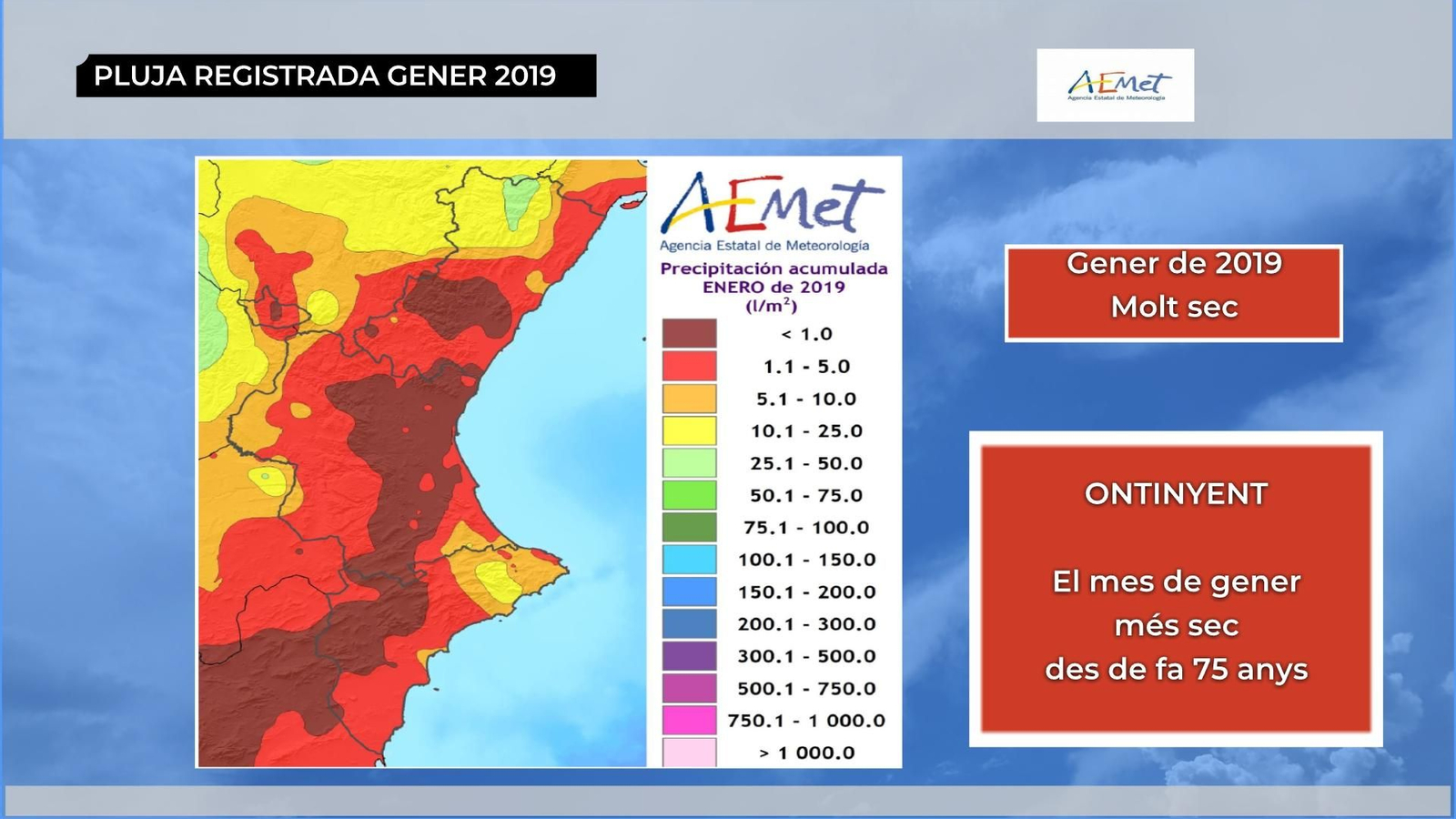 Costa recordar quan vam tindre les últimes pluges generals i generoses. Veníem d'una tardor extremadament plujosa, però aquest hivern s'ha estroncat la tendència. Ja desembre va ser sec, però el mes que acabem de deixar es pot qualificar de molt sec, amb un dèficit de precipitacions del 90%. A tot el conjunt del territori, només han caigut 3,8 l/m² durant el gener de 2019, quan la mitjana dels últims 30 anys es de 42,6 l/m².