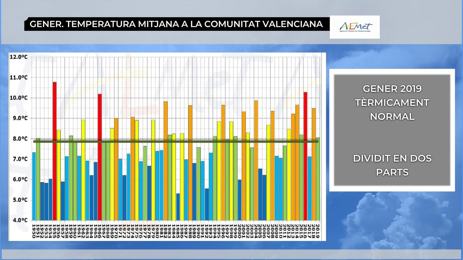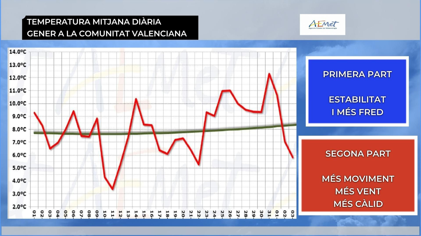 Pel que fa a les temperatures, el passat gener es pot qualificar de normal, amb una temperatura mitjana en el conjunt del territori de 8 °C, només 0,2 °C superior a la mitjana climàtica dels últims 30 anys. El mes l'hem de dividir en dues parts prou diferenciades. En la primera, la presència de l'anticicló ens va deixar nits molt fredes, especialment en zones fondes on s'acumulava l'aire fred per l'absència de vent. Ja durant la segona meitat del mes, l'anticicló es va retirar cap a l'oest i vam estar sota la influència de vents terrers, és a dir, que bufen de terra cap a mar. Aquests vents tenen la particularitat d'arribar molt secs i recalfats al litoral i prelitoral valencià, motiu pel qual les temperatures van experimentar un ascens, amb valors de fins a 20 °C.
