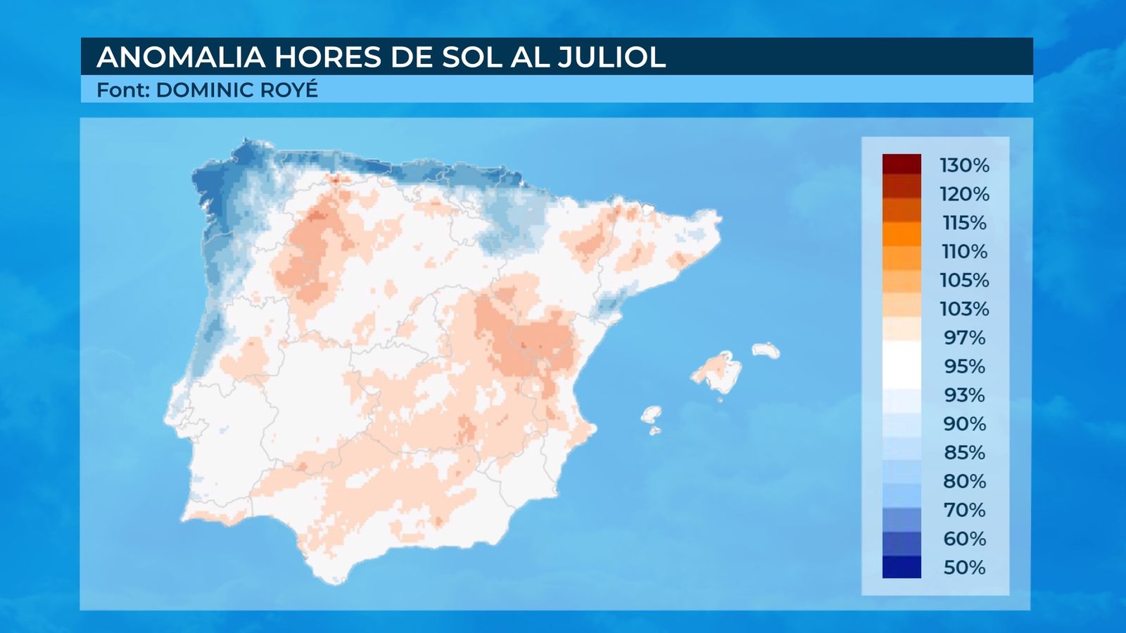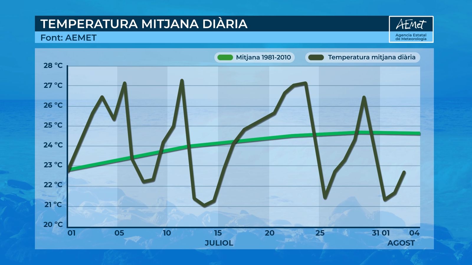 Tot i el caràcter càlid del juliol d'enguany, és el més fresc des de 2014. S'han alternat períodes de temperatures més baixes del normal amb diverses entrades de vent de ponent, que han disparat la temperatura fins als 40 °C. A més, cal remarcar que les nits no han sigut especialment càlides, sobretot en zones allunyades de la costa.