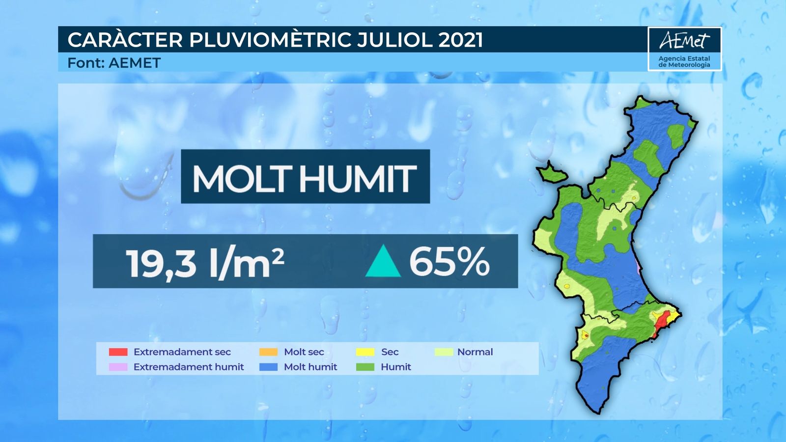 Pel que fa a la pluja, el mes ha sigut el més humit des de 2015 i el segon més plujós de tot el segle XXI. Cal tindre en compte, però, que juliol és el mes més sec de l'any i per poc que ploga, ja se supera la mitjana climàtica. Les pluges han tingut una distribució molt irregular i mentre que en algunes zones del nord i del golf de València s'han superat les mitjanes amb escreix, en àrees de la Marina pràcticament no ha plogut. Destaquen les quantitats arreplegades al litoral de la Ribera Baixa i la Valldigna, on s'han superat els 70 l/m².