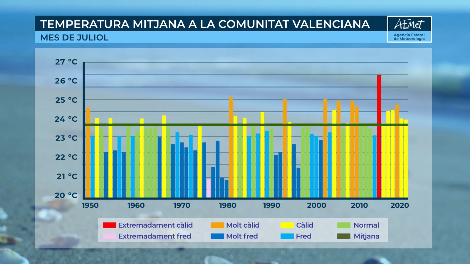 Un juliol amb un comportament irregular. Així podríem definir, a grans trets, el seté mes de l'any a la Comunitat Valenciana. Les temperatures han sigut lleugerament més elevades del normal, amb una mitjana en el conjunt del territori de 24,4 °C, que ha superat en 4 dècimes la mitjana climàtica. Pel que fa a la precipitació, el mes es pot qualificar com a molt humit, ja que s'han arreplegat 19,3 l/m², cosa que significa un 65% més del que habitualment sol ploure.
