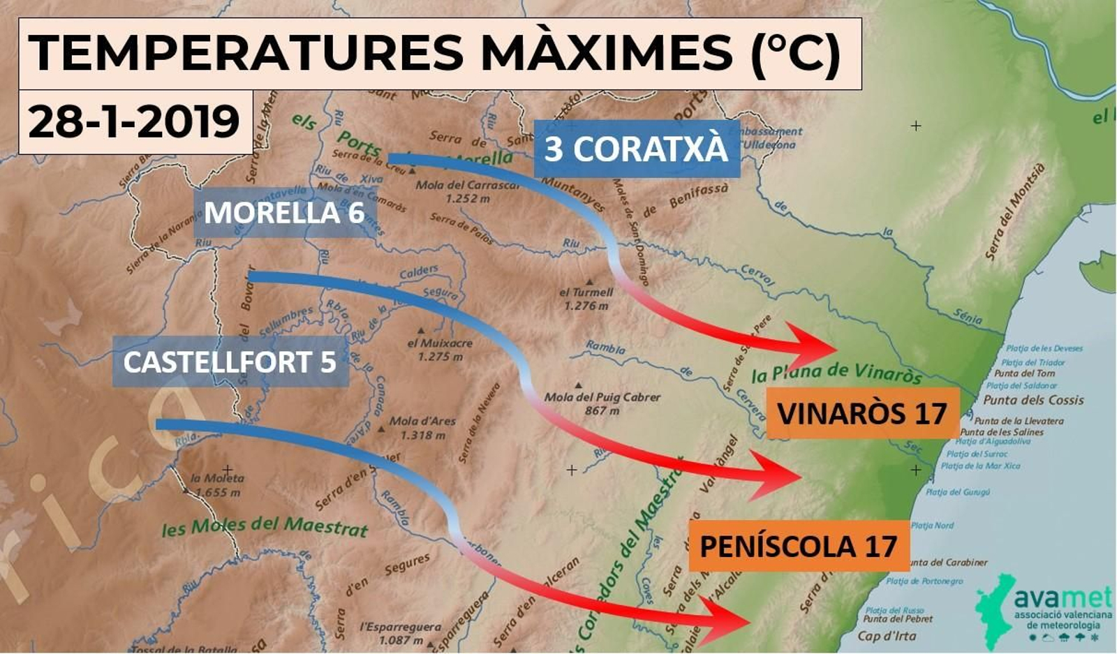 Un clar exemple d'este fenomen es va donar el dia 28 de gener, quan bufava fort vent de mestral a l'interior de Castelló. A la zona muntanyosa es van acumular núvols que van deixar fins i tot alguna gota, mentre que a la costa es gaudia d'un dia completament assolellat, i de temperatures agradables.