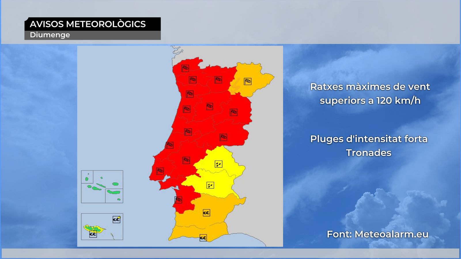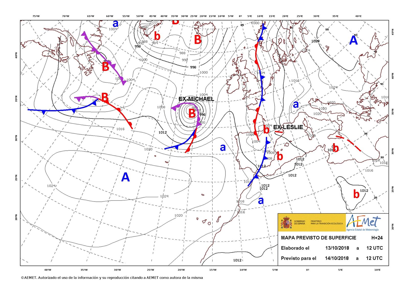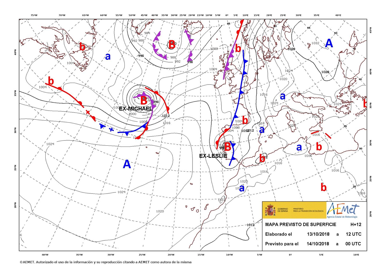 El centre de la borrasca profunda en què s'ha convertit Leslie circularà pel nord de Portugal cap a la Meseta nord. Les zones més afectades per ratxes de vent fortes i pluges intenses la primera part de diumenge serà l'oest de la Península i també la zona d'Andalusia. A hores d'ara hi ha actius avisos de nivell roig a Portugal, per ratxes de vent que podran superar els 120 km/h. A nosaltres no ens afectarà de manera directa, però les pluges i tronades localment fortes arribaran al Mediterrani diumenge de vesprada.
