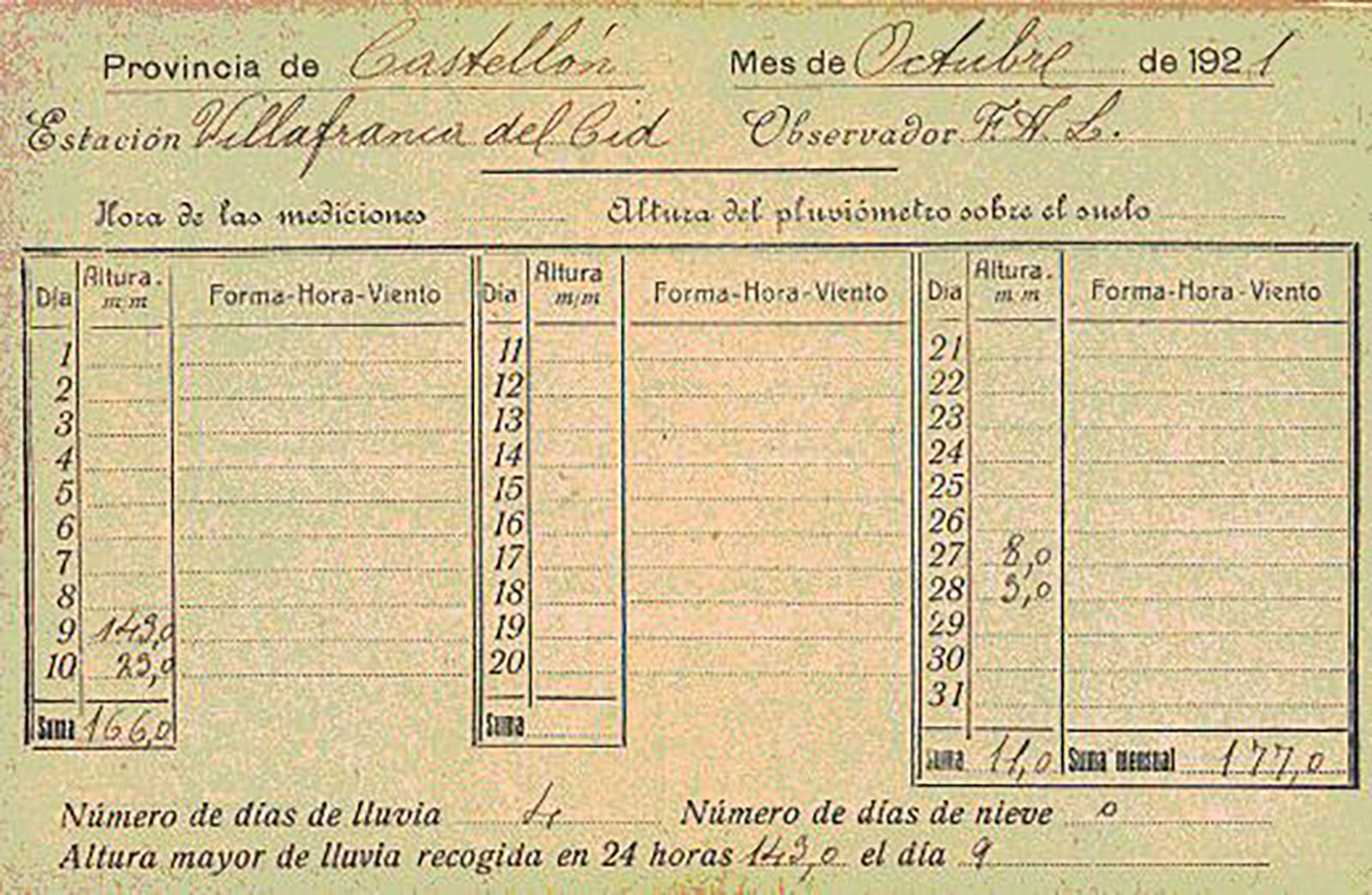 Butlletí pluviomètric de Vilafranca (Alt Maestrat) d'octubre de 1921, observatori integrat a la xarxa de la FAL / Delegació de l'AEMET de València