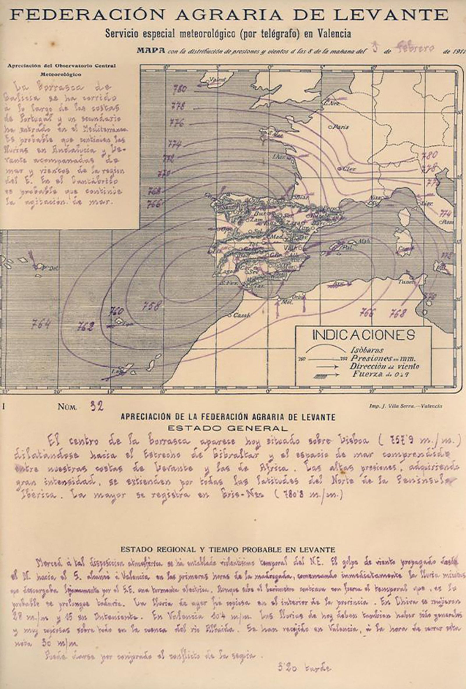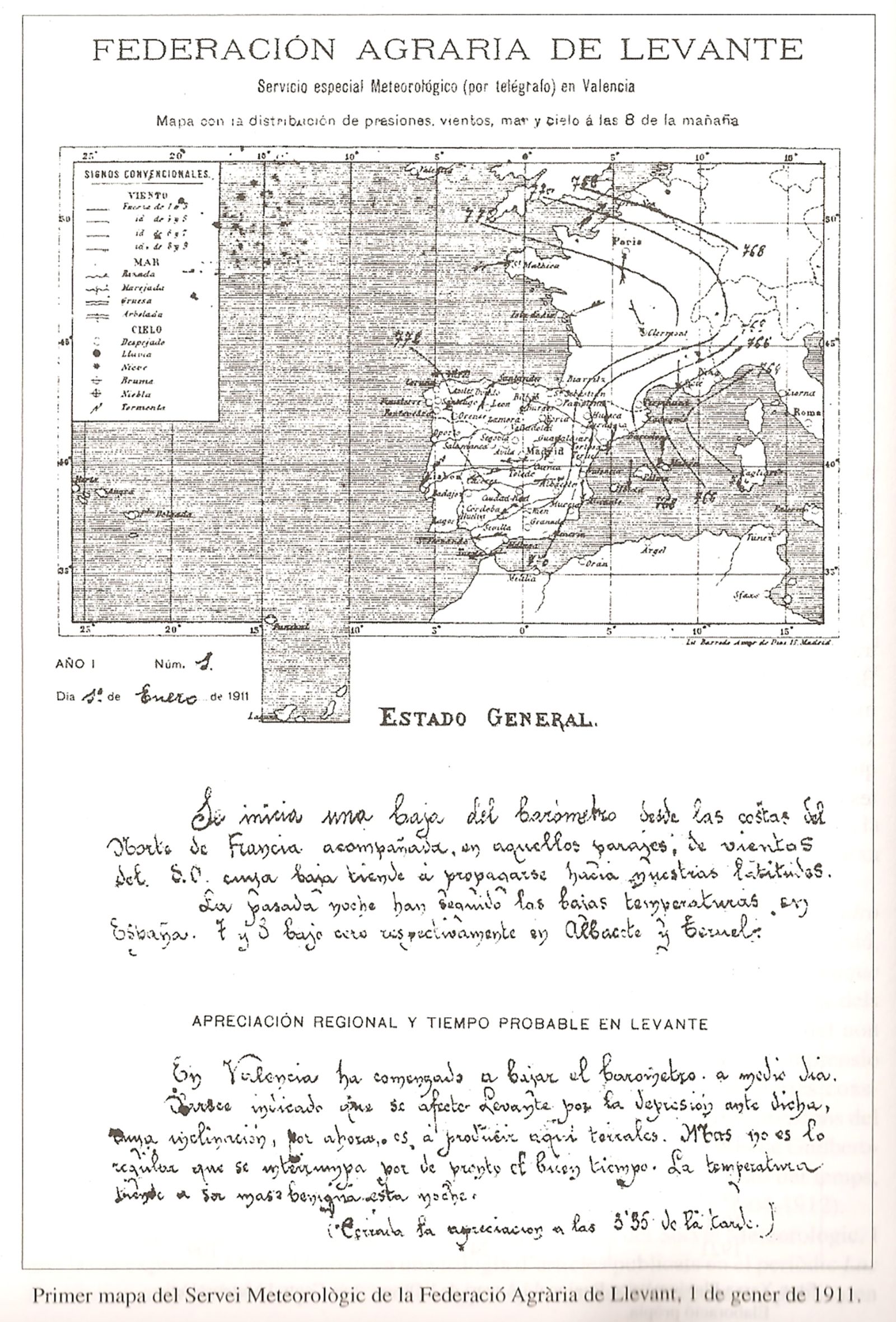 Primer mapa del Servicio de la Federación Agraria de Levante, 1 de gener de 1911. Anàlisi i temps probable Mapa del Servicio Meteorológico del temporal de llevant de l'1 de febrer de 1911 /
