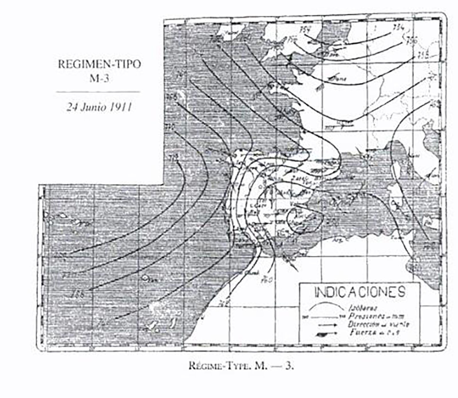 En la figura es troben dos tipus de temps de la categoria marítima (M), que es caracteritza per un centre d'altes pressions situat a l'Europa Central o a la Gran Bretanya, i per una zona depressionària al Marroc o Algèria que dóna un flux de procedència marítima a la façana mediterrània peninsular. En el tipus M, el temps és humit i les pluges poden ser intenses i persistents, amb baixes temperatures i neu a l'hivern en cotes baixes. Iranzo és un vertader precursor a l'hora d'assenyalar la importància de la ubicació exacta de la borrasca mediterrània en una situació de llevant per tal de determinar la intensitat, persistència i distribució de les pluges.