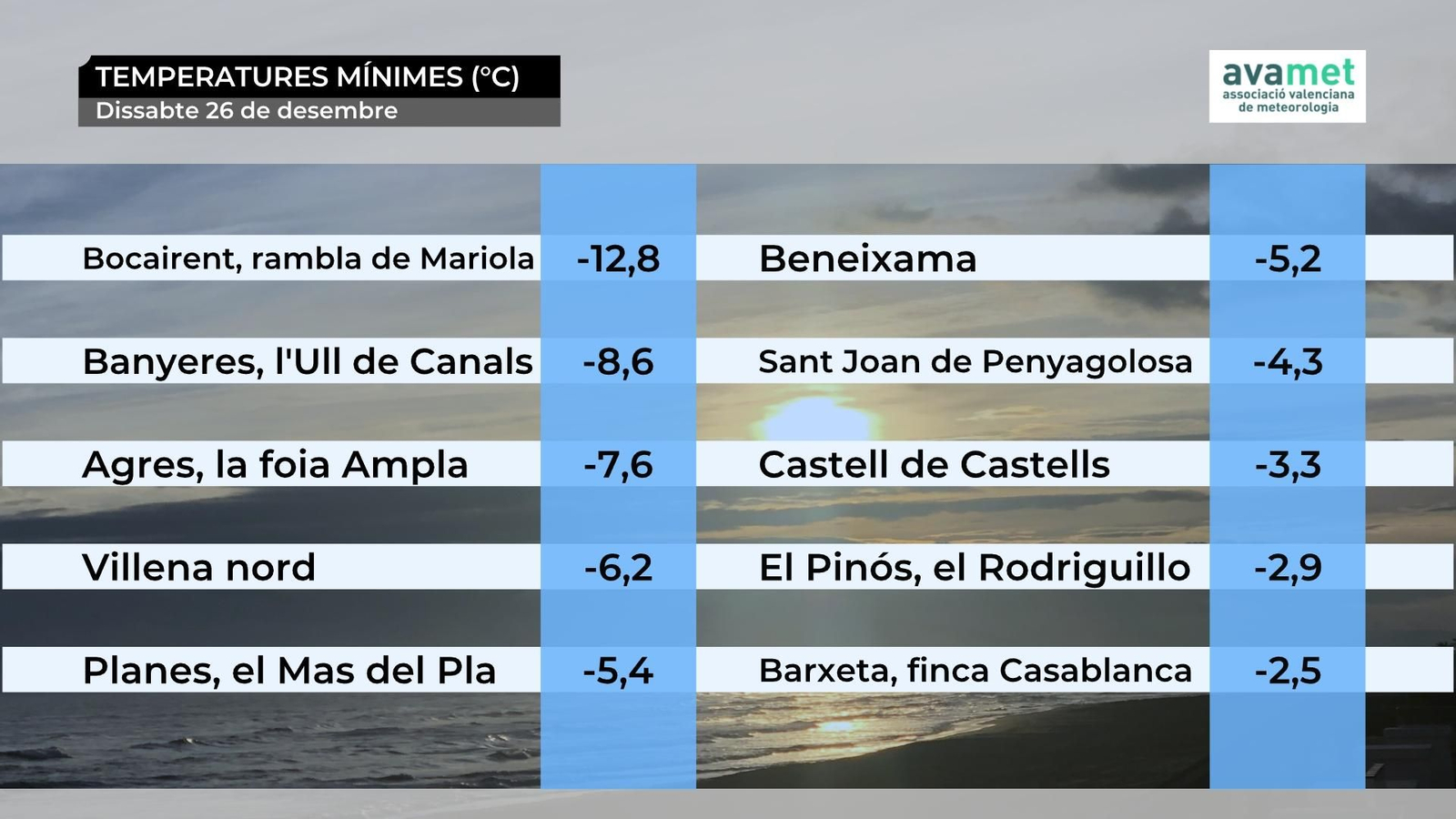 Nadal ens ha deixat congelats. L'arribada d'una massa d'aire fred d'origen àrtic ha fet baixar les temperatures mínimes de la matinada passada fins als -13 ºC a l'observatori de la rambla de Mariola, situat al terme municipal de Bocairent, a la Vall d'Albaida. És la segona temperatura més baixa dels últims cinc anys. Altres registres destacables són els -8 °C a Agres, a la Foia Ampla, els -6 °C Villena nord o els -5 °C a Coratxà, a la Tinença de Benifassà. Són dades proporcionades per la xarxa d'observatoris de l'Associació Valenciana de Meteorologia.