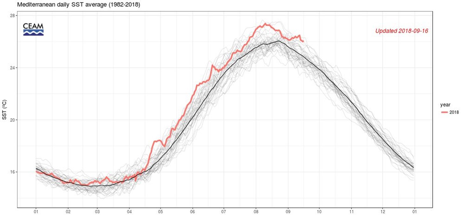 La temperatura superficial del Mediterrani està enguany per damunt de la mitjana. FONT:CEAM