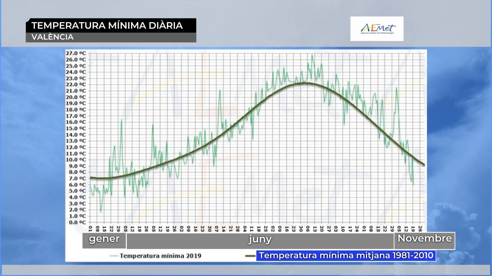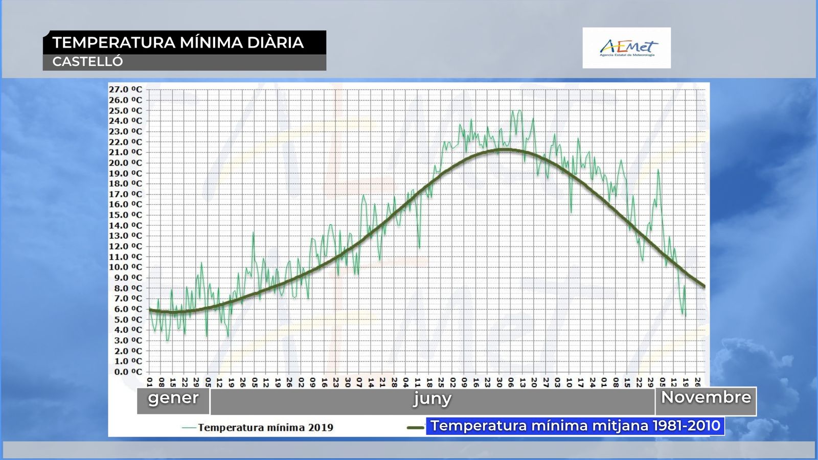 Per a trobar temperatures mínimes tan baixes hem d'anar a l'inici de l'any, a l'hivern passat. En el cas particular de Castelló i de València, hem de retrocedir fins al mes de febrer per a trobar temperatures inferiors a la nit passada.