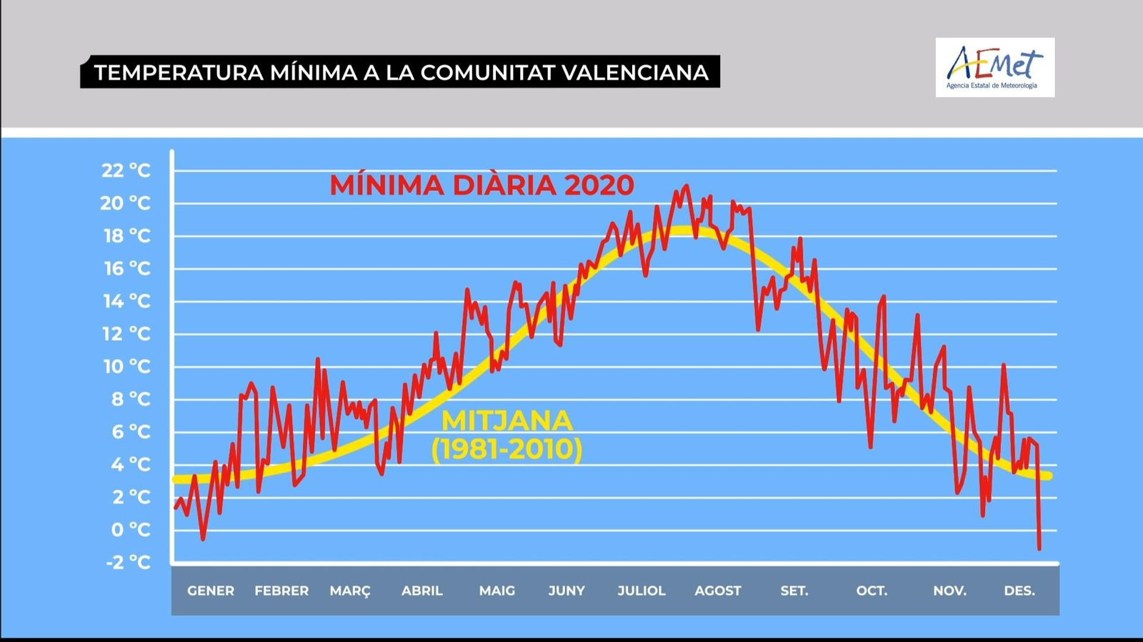 Segons dades d'Aemet, la matinada del 27 de desembre de 2020 ha sigut la més freda des de l'onze de gener de 2019. Feia pràcticament dos anys que no es registraven unes temperatures tan baixes.