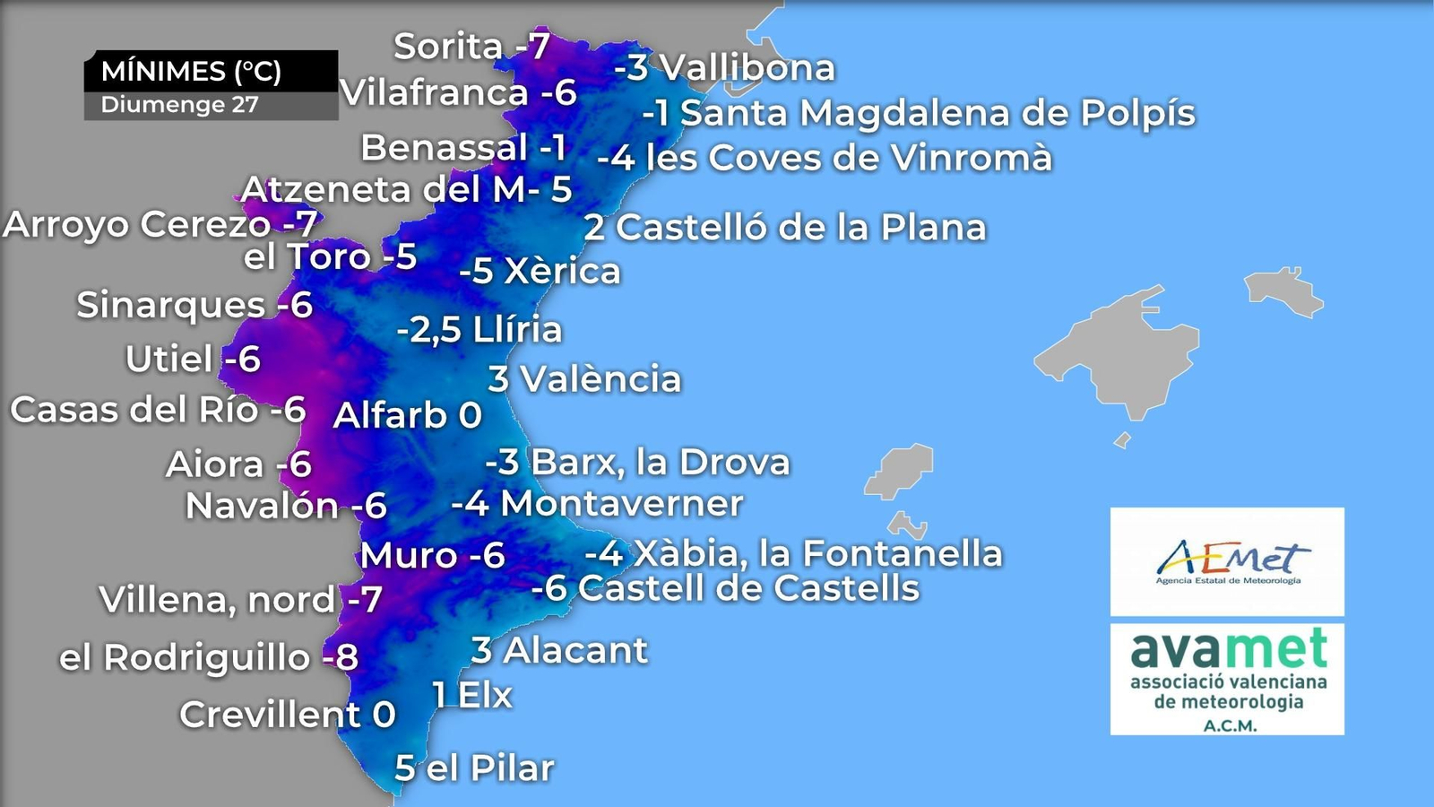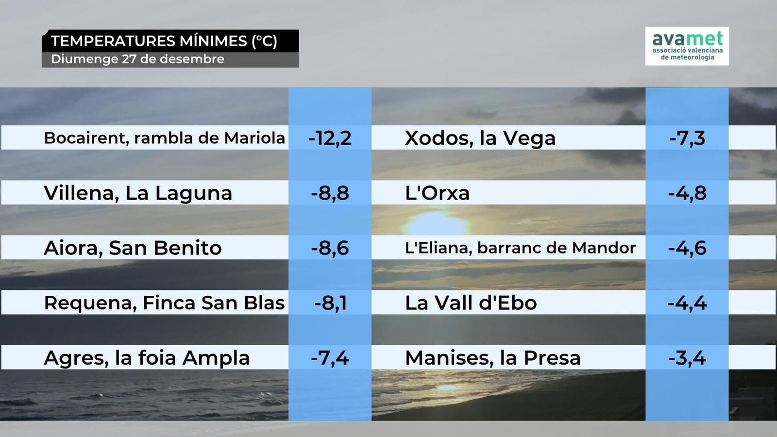 Ambient de ple hivern durant l'últim cap de setmana de 2020. Si la matinada de divendres les temperatures ja van baixar fins als -13 °C a l'observatori de la rambla de Mariola, al terme municipal de Bocairent, la matinada de dissabte ha sigut encara més freda en el conjunt del territori valencià. El vent ha afluixat al nord, amb la qual cosa les mínimes han sigut més baixes, amb valors de fins a -7 °C en algunes localitats dels Ports.