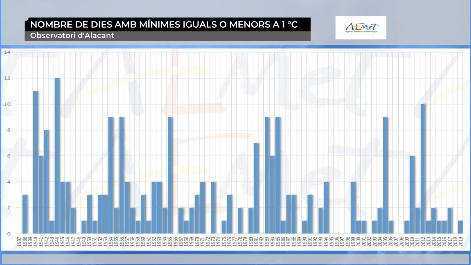 A la ciutat d’Alacant es va registrar 1 °C de temperatura mínima. L’última vegada que s’hi va registrar aquest valor va ser el 5 de desembre del 2017, quan van tindre 0,9 °C.