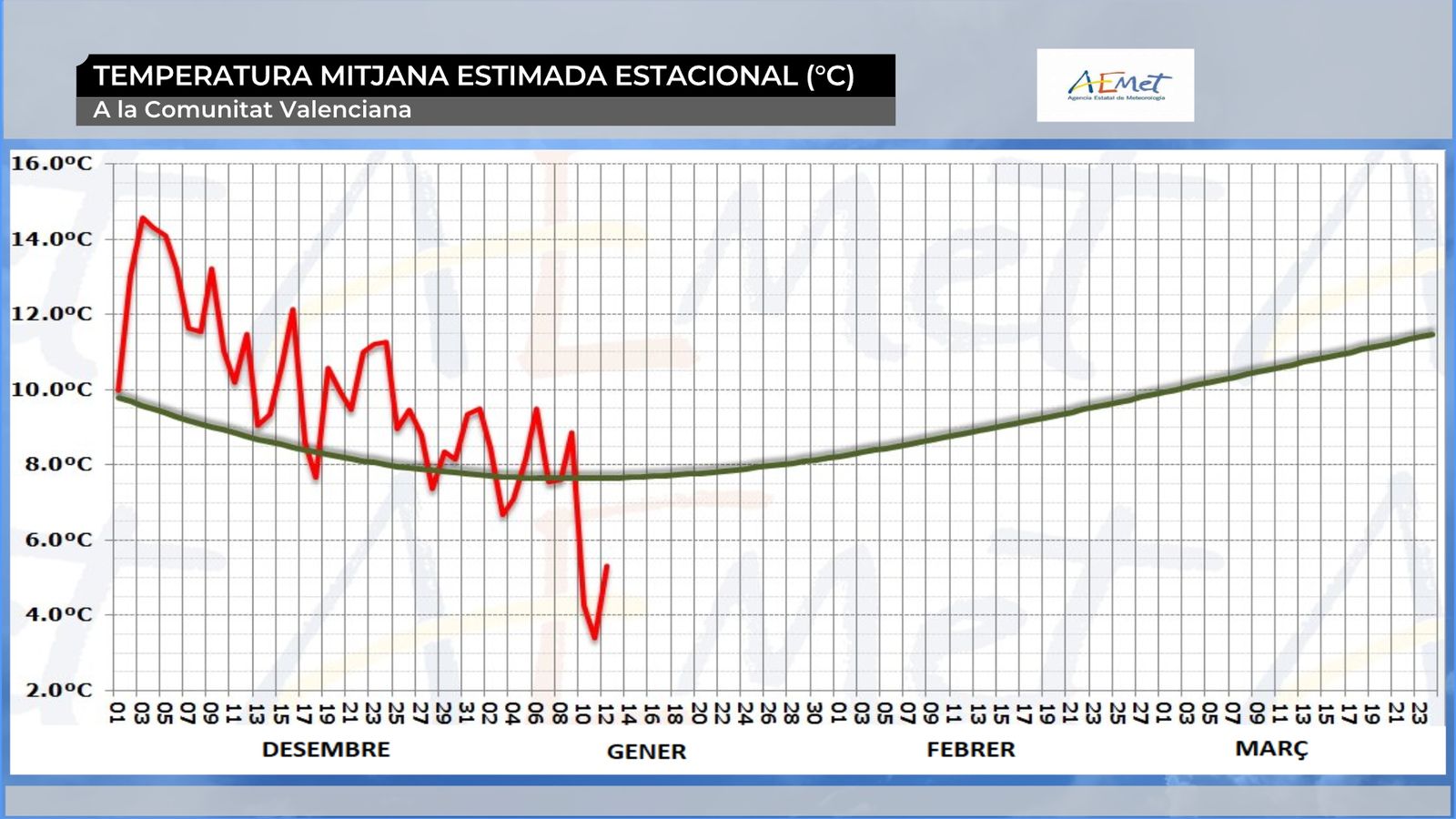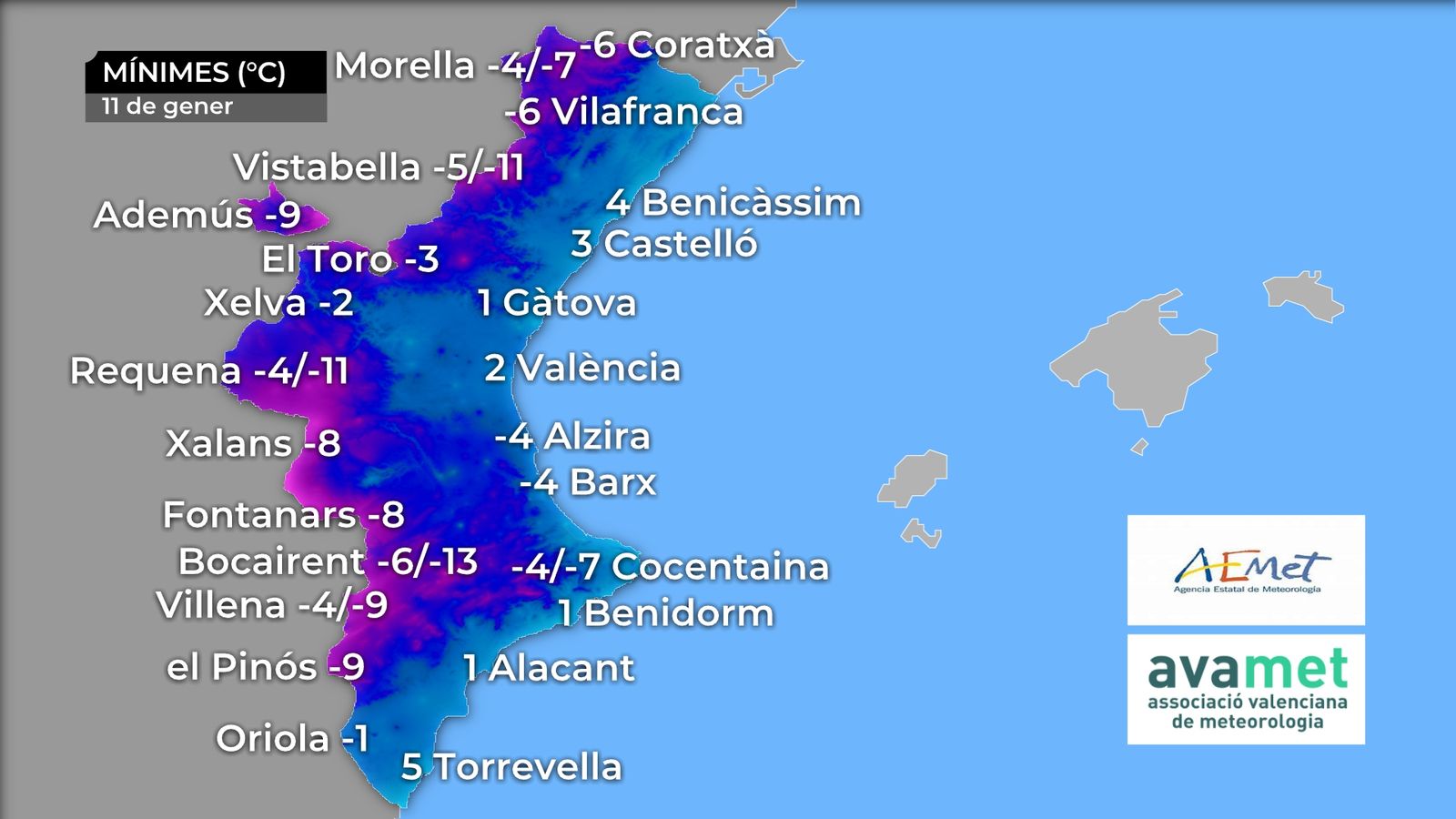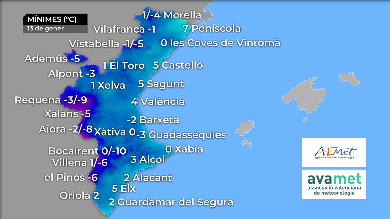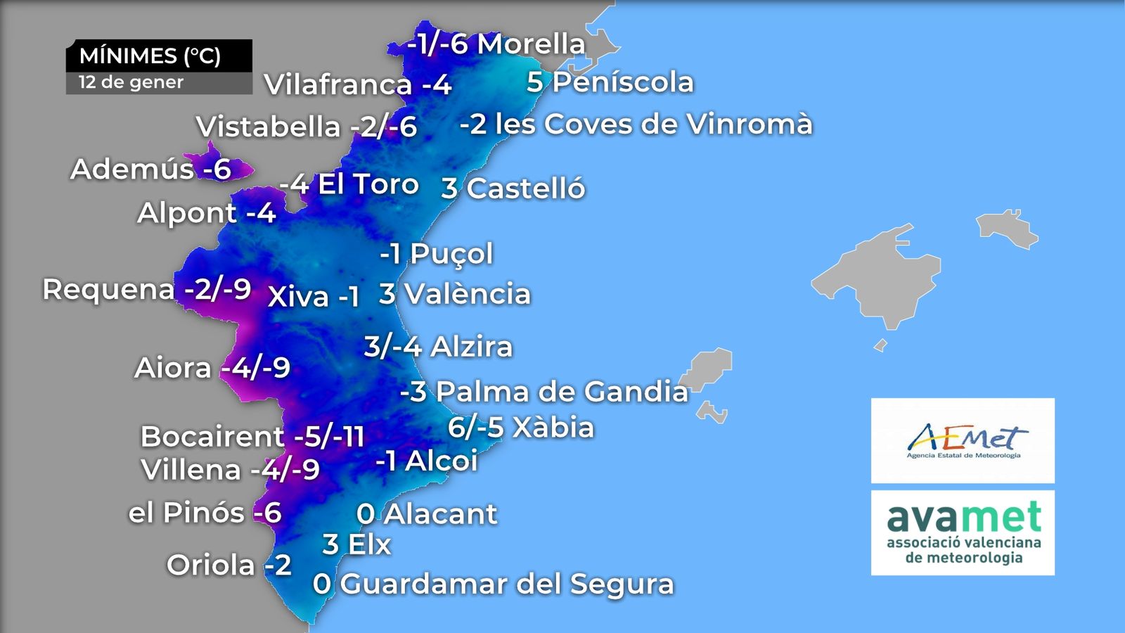 L’entrada d’una massa d’aire fred a la península ha produït la davallada de les temperatures a la Comunitat Valenciana durant els últims dies. Han sigut abundants els registres de temperatures mínimes sota els zero graus, sobretot a l’interior, però també en punts més pròxims a la costa.