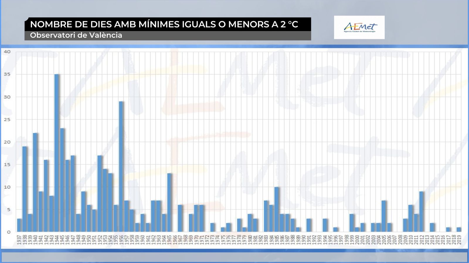 Divendres van registrar 2 °C a l’observatori de València. Una situació que sol donar-se tots els anys, tot i que cada vegada és menys freqüent.