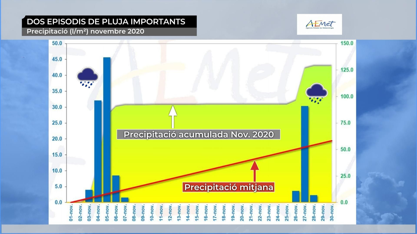 Tot i això, els dos temporals han convertit novembre de 2020 en un mes extraordinari pel que fa a les precipitacions, convertint-lo en el segon mes de novembre més plujós dels últims trenta anys al conjunt del nostre territori. De fet, segons algunes dades facilitades per l’Agència Estatal de Meteorologia (Aemet):