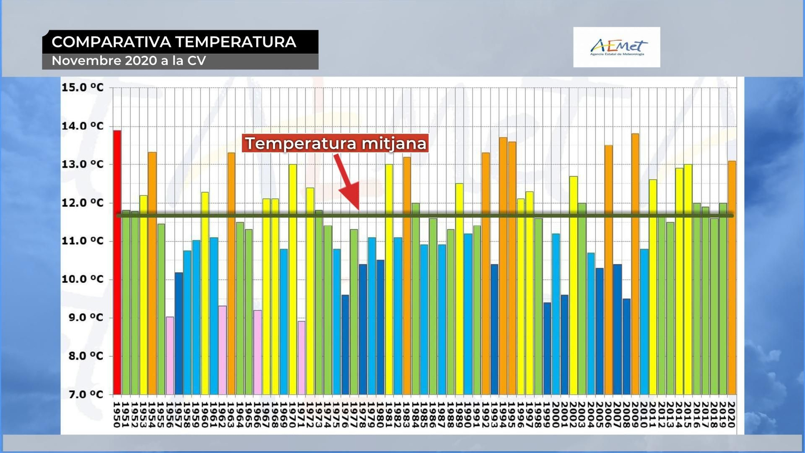 Al conjunt de la Comunitat Valenciana, la temperatura s’han situat quasi un grau i mig per damunt de la mitjana, convertint novembre de 2020 en el mes de novembre més càlid de la dècada, i el desé de la sèrie històrica, des de 1950. El més destacable ha sigut que les temperatures s’han mantingut anòmalament altes pràcticament tot el mes. Principalment, aquest fet s’ha donat per la persistència de la situació anticiclònica, que ha propiciat que en hores diürnes l’anomalia tèrmica fora al voltant de 2ºC. Les comarques d’interior han sigut les que han enregistrat una anomalia càlida més elevada, arribant als quasi 3ºC per damunt de la mitjana a municipis dels Ports, a l’interior nord de Castelló.