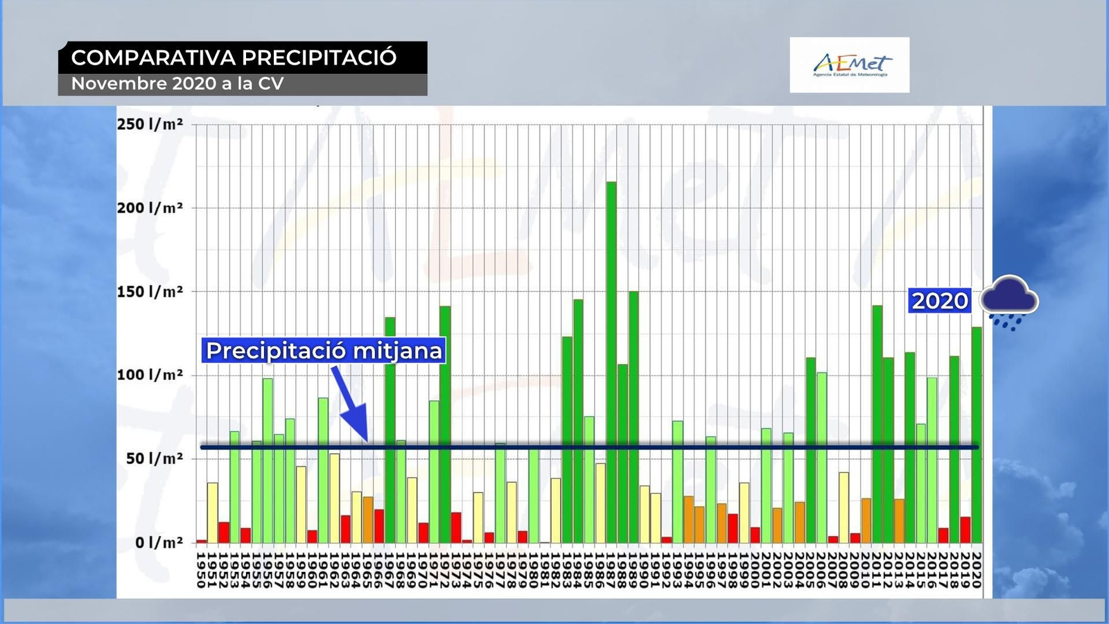 Aquest novembre s’ha caracteritzat pluviomètricament pels dos temporals de pluja que hem tingut a principi i final de mes, deixant registres molt importants a les comarques de València i Castelló, i amb poca o nul·la precipitació entre aquests dos episodis. Pel que fa a les temperatures, ha sigut més càlid del normal. Ho veiem més detalladament.