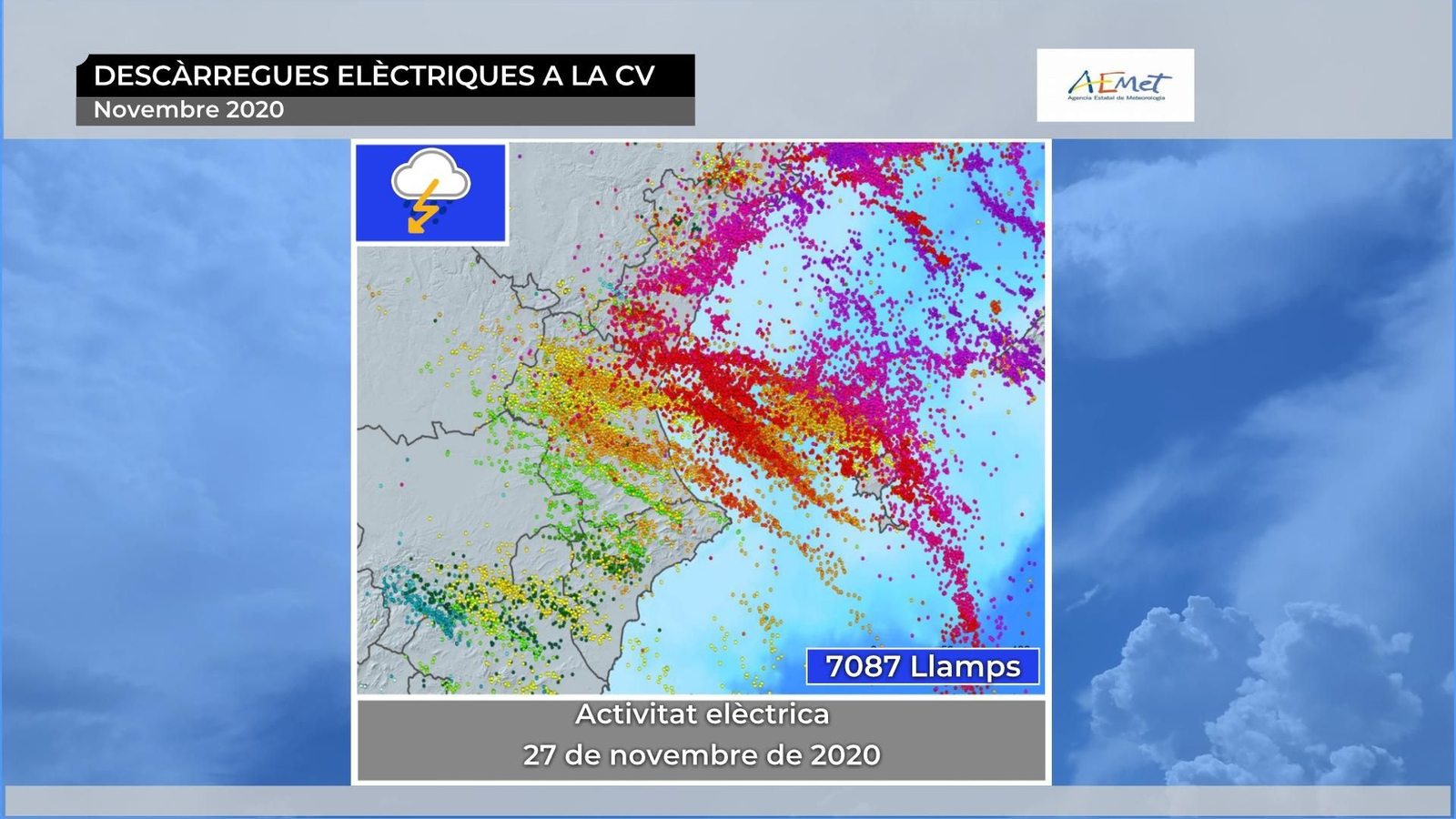Un altre fet que ha convertit aquest novembre en extraordinari és l’acompanyament elèctric. El dia 27, amb 7.087 llamps, va ser el dia amb més descàrregues elèctriques per a un mes de novembre des que es prenen dades, doblant els valors de descàrregues de l’anterior rècord. I si tenim en compte tots els mesos de l’any, se situaria en l’onzé lloc, amb valors típics dels mesos de final d’estiu, que és quan acostuma a ser màxima l’activitat elèctrica.