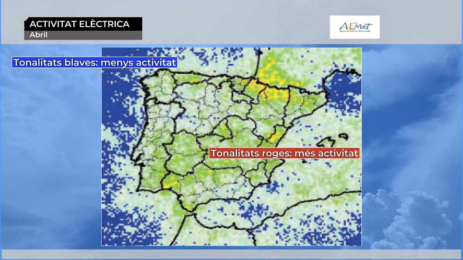 El mapa de llamps indica com a l’abril aquests s’intensifiquen sobretot a les zones d’interior, amb més de 2 dies amb llamps de mitjana aquest mes.
