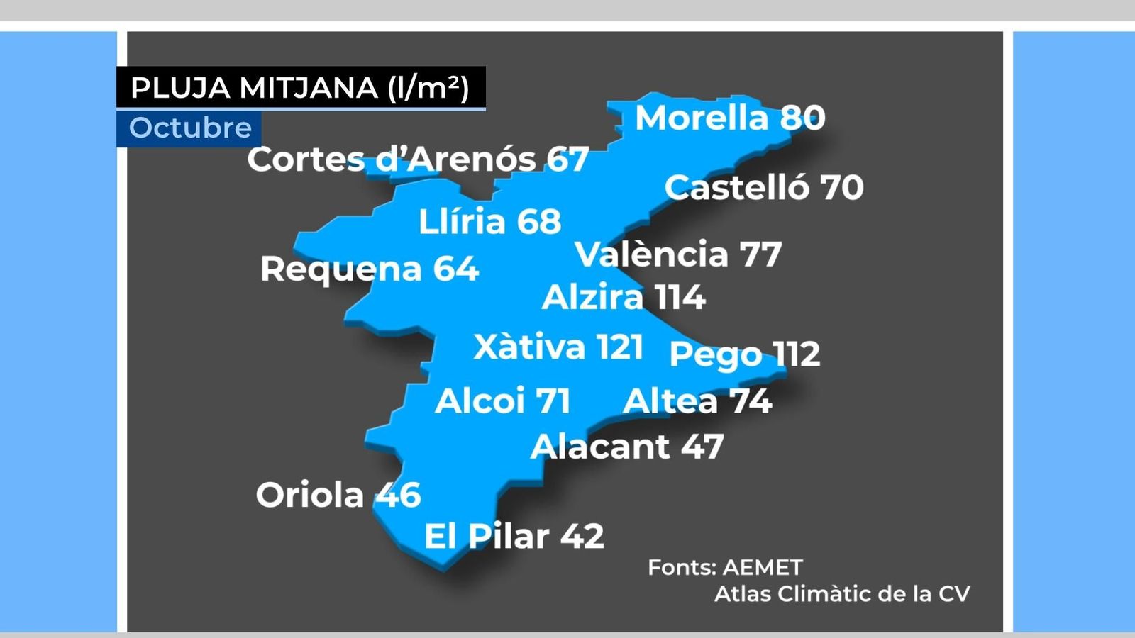 Però tornem a l'octubre, el protagonista de la nostra història. Si ens fixem en les mitjanes de precipitació, veiem que en gran part de les comarques centrals, la pluja supera els 100 l/m². Pel que fa a capitals de comarca, destaquen Xàtiva, amb 121 l/m² o Alzira, amb 114 l/m². I ací arribem a una altra característica de las nostra pluviometria: poca pluja i concentrada temporalment. En zones de muntanya interiors, la precipitació està més repartida al llarg de l'any gràcies a les tronades que s'hi registren a l'estiu.