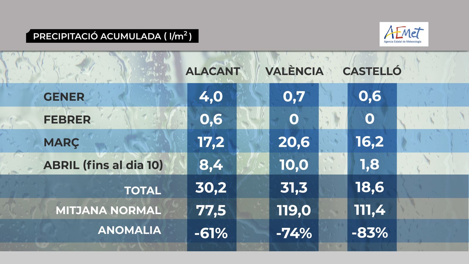 Les quantitats registrades, no han sigut massa quantioses, a l’abril s’han arreplegat 8,4 l/m² a Alacant, 10 l/m² a València i 18, 6 l/m² a Alacant. En termes de precipitació acumulada (des de començament d’any fins al 10 d’abril), al centre i sud les quantitats acumulades estan al voltant dels 30 l/m² mentre que al nord la quantitat ha sigut menor. Si comparem aquesta dada amb la mitjana normal, a pesar de les precipitacions que s’han produït els darrers dies, encara estem en valors inferiors de la mitjana, concretament un 61% menys de precipitacions s’ha produït a Alacant, un 74% menys a València i un 83 % a Castelló.