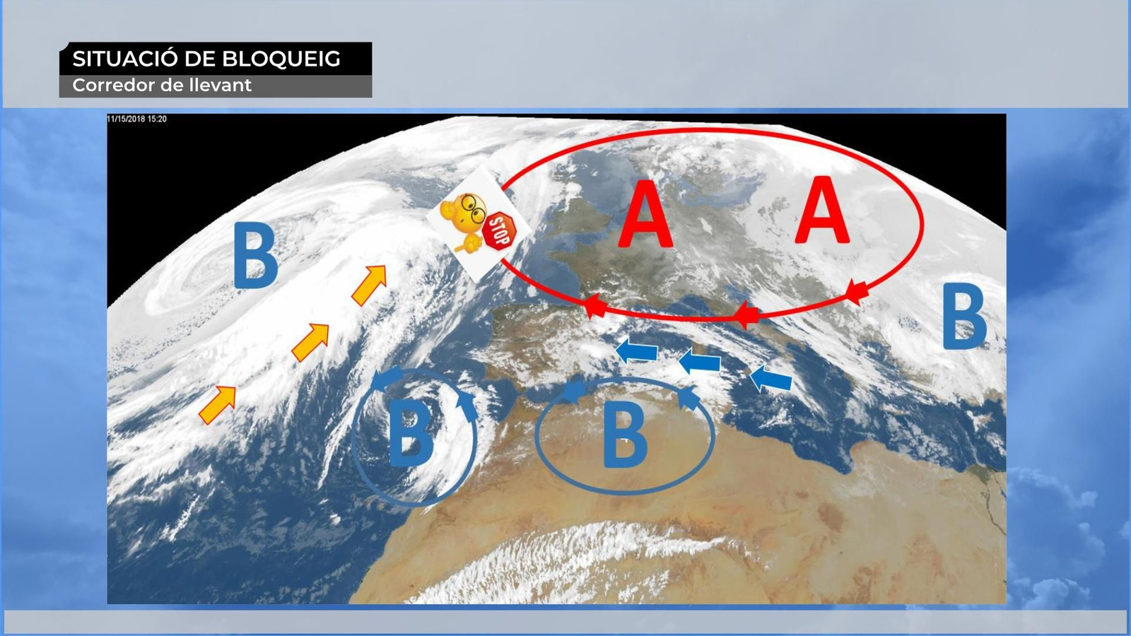 I tot plegat es produeix per un anticicló de bloqueig que tenim situat al centre i nord d'Europa. Les borrasques atlàntiques no poden avançar cap a l'est i es veuen obligades a descendir cap a la Península. Un camí que ja han hagut de seguir moltes pertorbacions que ens han deixat una tardor plujosa com feia anys que no teníem.