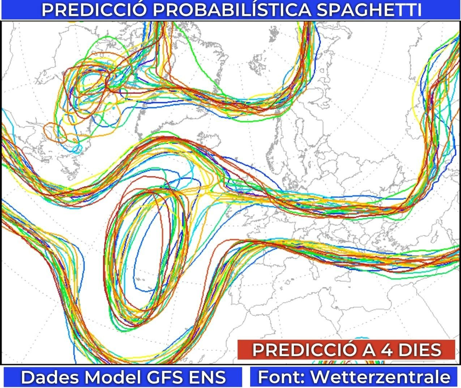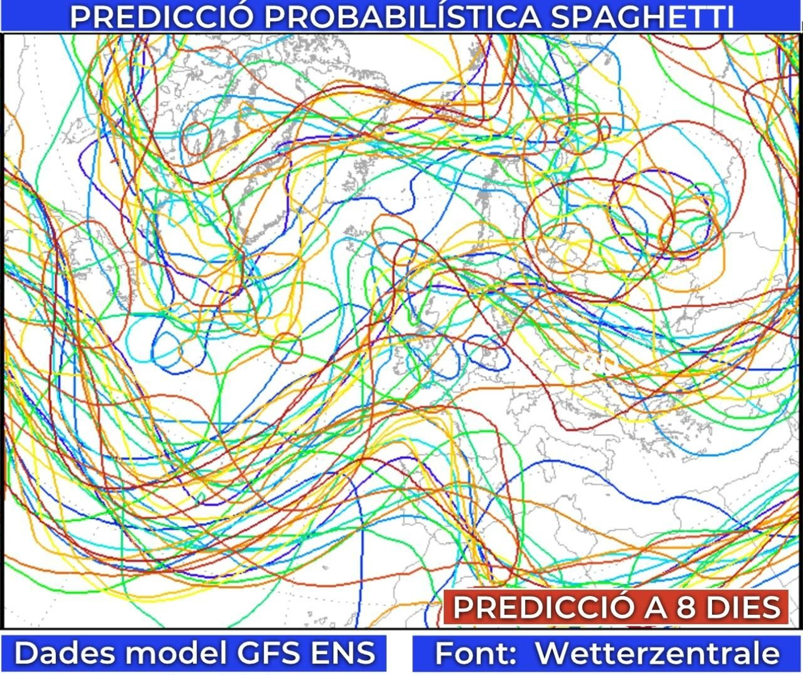 Aquest és un dels exemples de predicció probabilística. El que es pot veure a les imatges són diferents prediccions d'un mateix model a 4 dies vista (esquerra) i a 8 (dreta). Com es pot veure, en la primera els diferents col·lectivitats convergeixen cap a una situació atmosfèrica amb xicotetes discrepàncies, però en la segona es pot observar com cada un dels ensembles veu una situació atmosfèrica diferent i no es pot extraure cap conclusió.