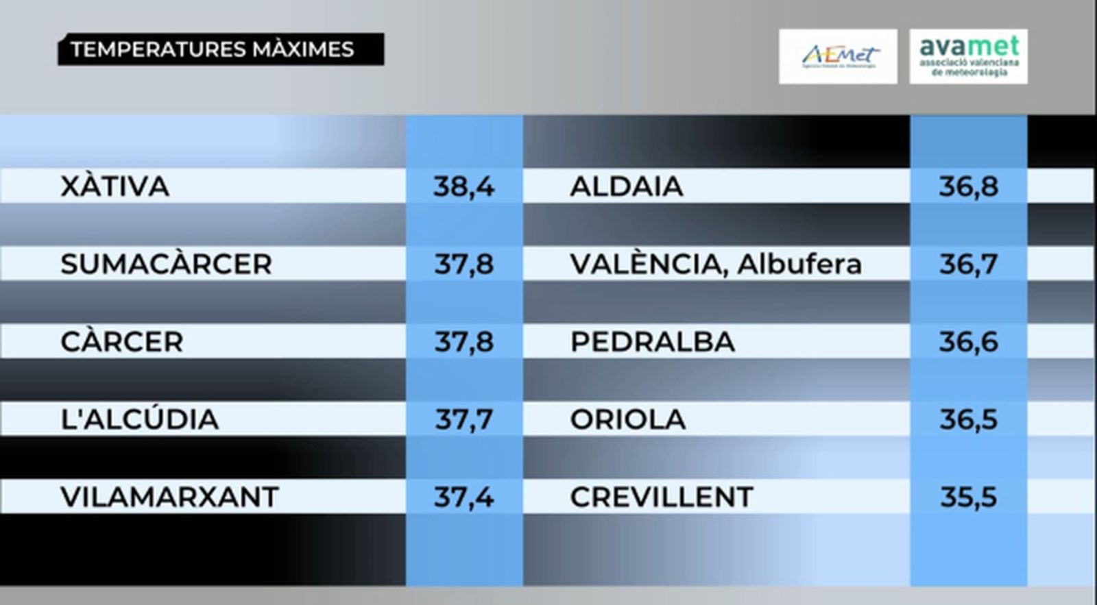 Les comarques del sud no han quedat al marge de la calor i s'ha arribat als 36,5° a Oriola i Carcaixent. Calor més moderada al nord, tot i que Castelló ha arribat als 33° i Vinaròs als 32,5°. De fet, si ens fixem en el mapa de les màximes registrades d'Avamet, en poques zones del territori s'ha baixat dels 30°.