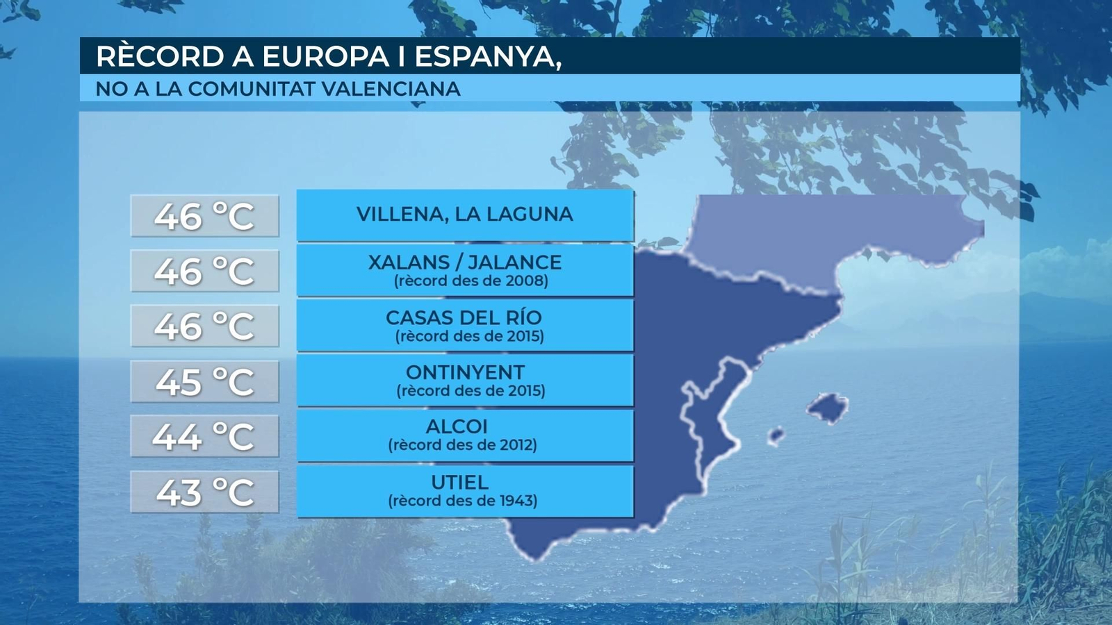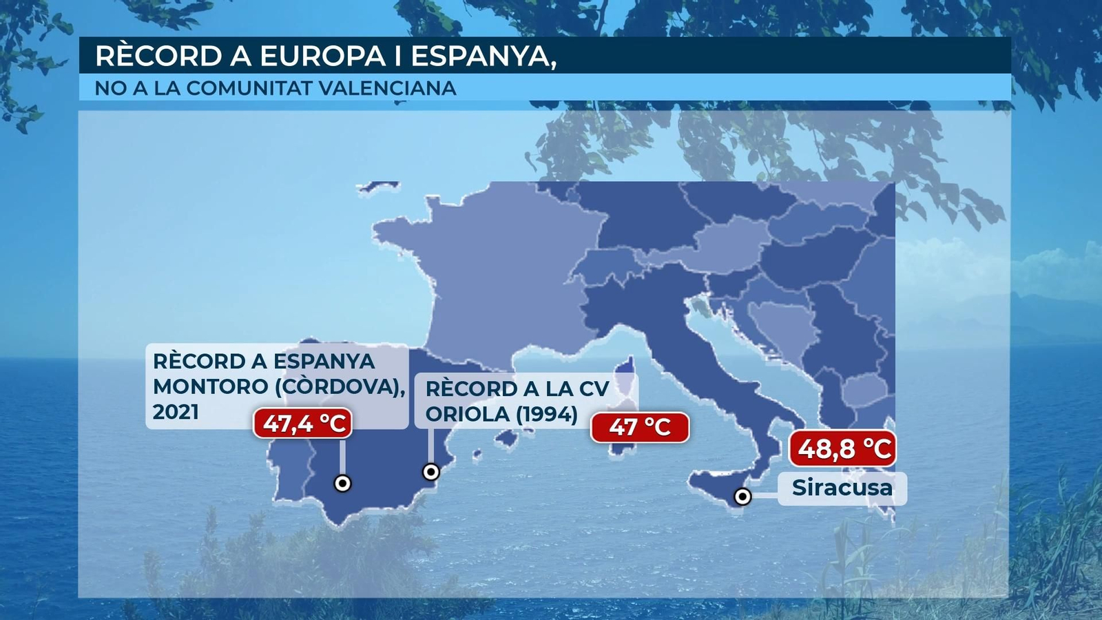 Molta calor, sí, però el rècord absolut de la Comunitat Valenciana ha quedat imbatut. Els 47 ºC registrats a Oriola el juliol de 1994 continua sent la temperatura més alta mai registrada al territori valencià. No ha passat el mateix a la resta d'Espanya, on els 47,4 ºC registrats a la localitat cordovesa de Montoro superen en una dècima l'anterior rècord espanyol, també registrat a Montoro l'any 2017. I si obrim el zoom, a Europa també s'ha registrat el rècord de temperatura màxima durant aquest episodi d'altes temperatures. Es va arribar als 48,8 ºC a Siracusa, a Sicília.