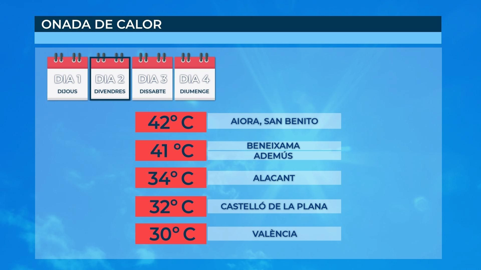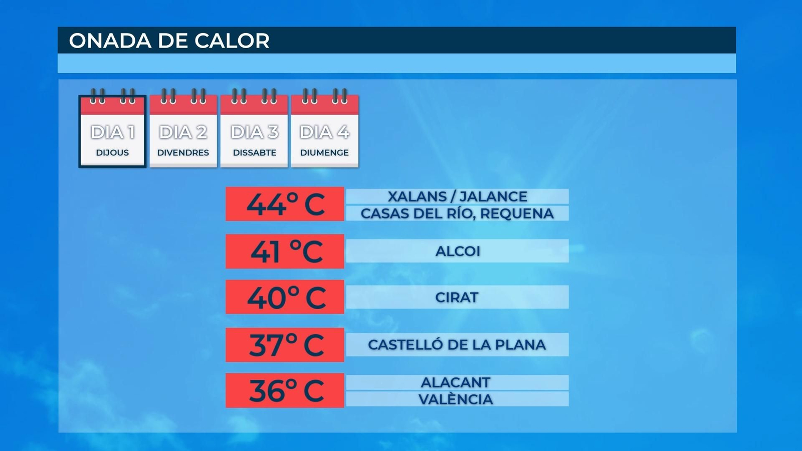 El primer dia de l'onada de calor, el dijous dia 12, el termòmetre es va enfilar fins als 44 ºC a Xalans i a Casas del Río, a Requena. El dia també ens va deixar temperatures molt elevades al litoral, ja que no va entrar al brisa i es va arribar a 37 ºC a Castelló de la Plana i a 36 ºC a Alacant i València. L'onada va entrar, i amb força, acompanyada de molta pols en suspensió.