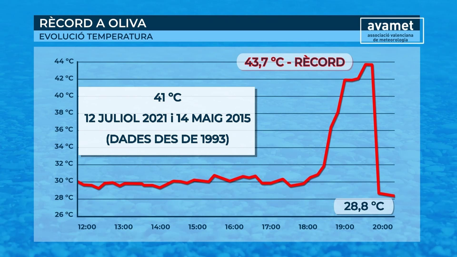 A part dels registres elevats de temperatura, l'onada de calor també ens deixa fenòmens violents associats a les tempestes seques, que deixen poca aigua, però que van acompanyades d'aparat elèctric i de fortes ràfegues de vent. Sovint generen forts corrents descendents d'aire, els temuts esclafits, que provoquen variacions molt sobtades de la temperatura. És el que va passar el diumenge dia 15 a la Safor, quan l'arribada d'un esclafit va disparar la temperatura a més de 40 ºC, com es veu en el següent gràfic de la localitat d'Oliva. Aquest fenomen molt sobtat i violent va ser el causant del rècord de temperatura màxima de tota la comarca. Per a saber més dels esclafits, podeu seguir l'explicació de Joan Carles Fortea en el següent link. https://www.apuntmedia.es/oratge/meteosaps/esclafits-rebentons-un-esclafit_1_1442753.html