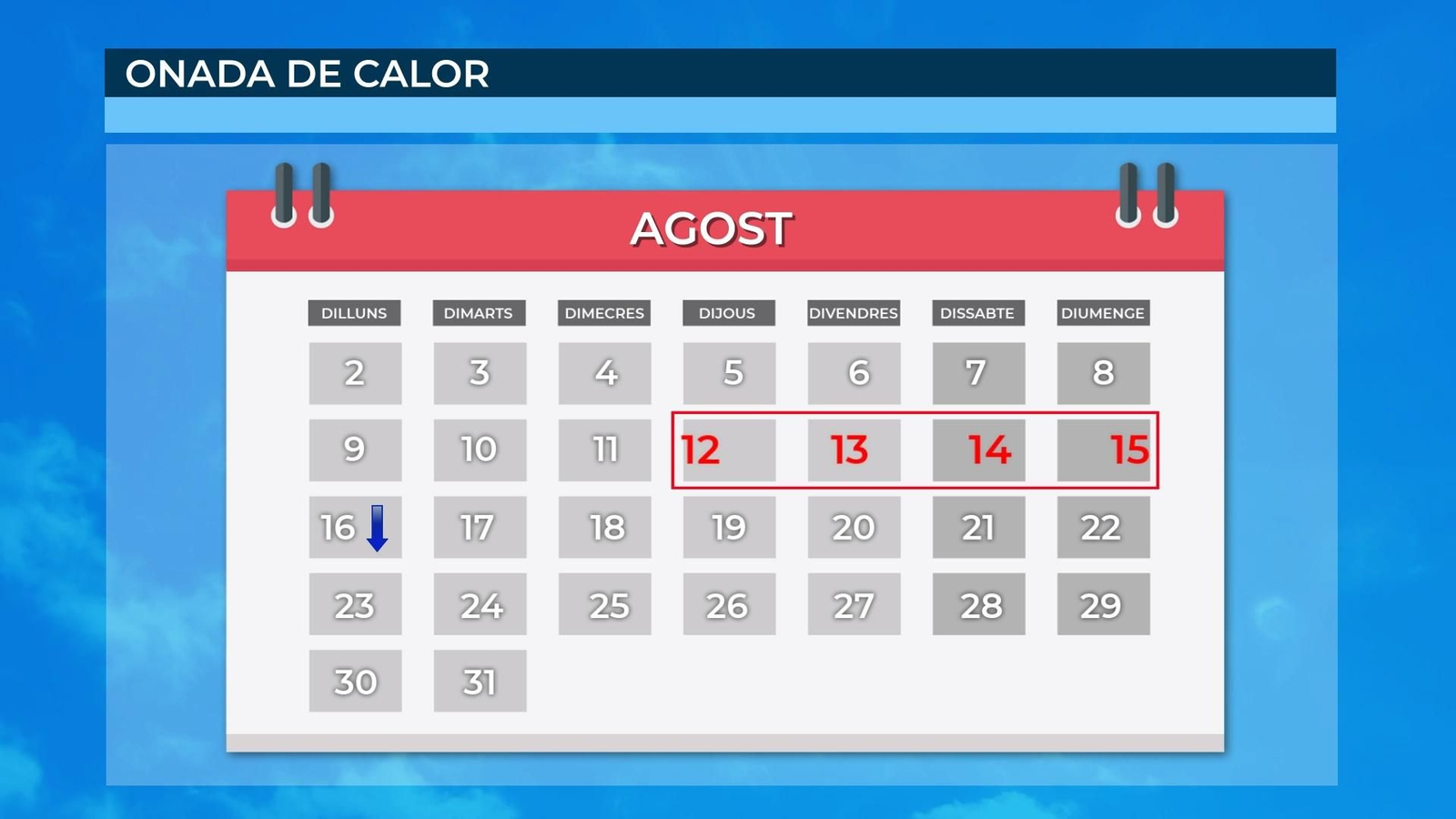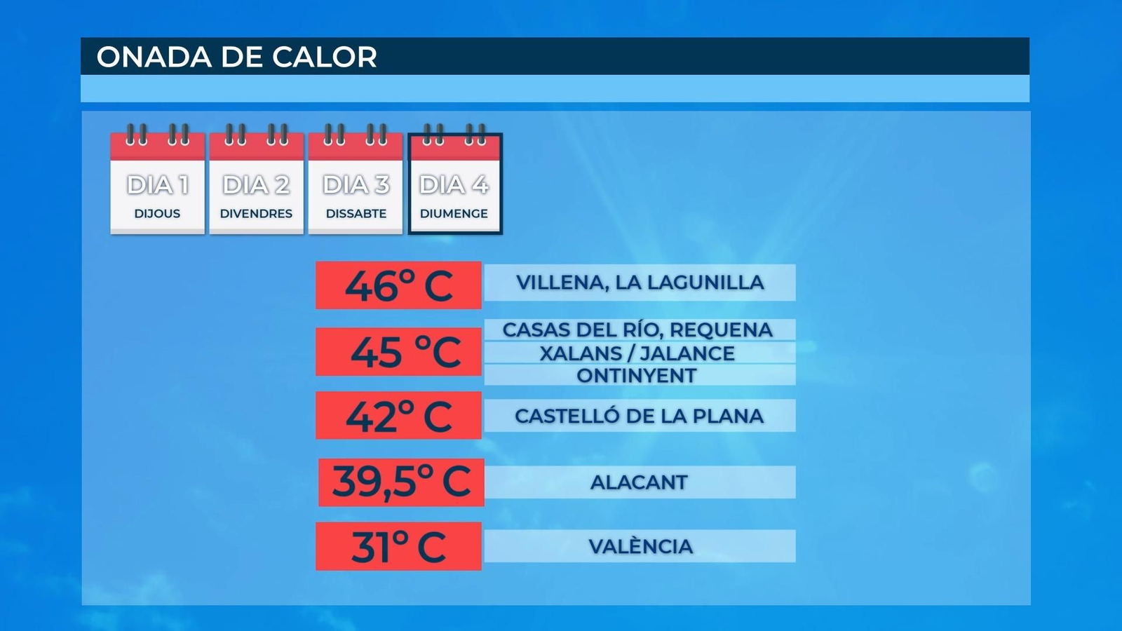 L'onada de calor del 12 al 15 d'agost deixa valors de 45 ºC en zones interiors. S'han batut rècords al Racó d'Ademús, la Plana d'Utiel-Requena i la Vall de Cofrents-Aiora, però el rècord absolut de la Comunitat Valenciana continua imbatut.