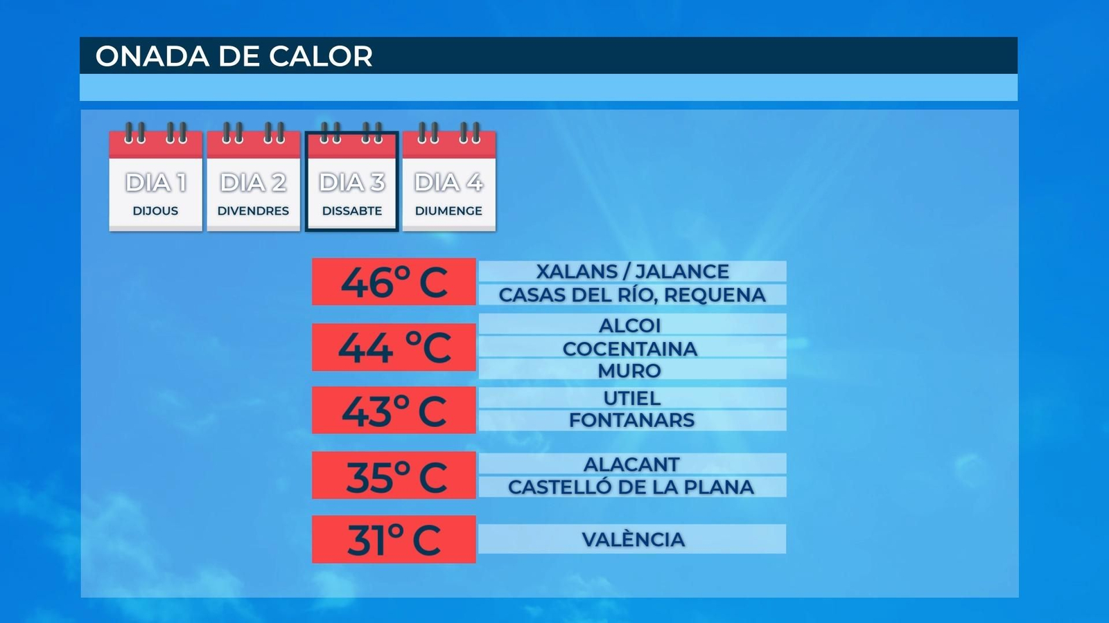El lleuger retrocés tèrmic experimentat divendres va servir per a agafar embranzida durant el cap de setmana, dies en què l'onada de calor va arribar al màxim. Dissabte 16 es van registrar 46 ºC a Casas del Río (Requena) i a Xalans. Però el Comtat, l'Alcoià, el Vinalopó i el Racó d'Ademús no es van quedar molt arrere i van marcar màximes de 43 ºC i 44 ºC. Una calor sufocant que va contrastar amb els 31 ºC de la ciutat de València, això sí amb humitats altíssimes al llarg de tot el dia.