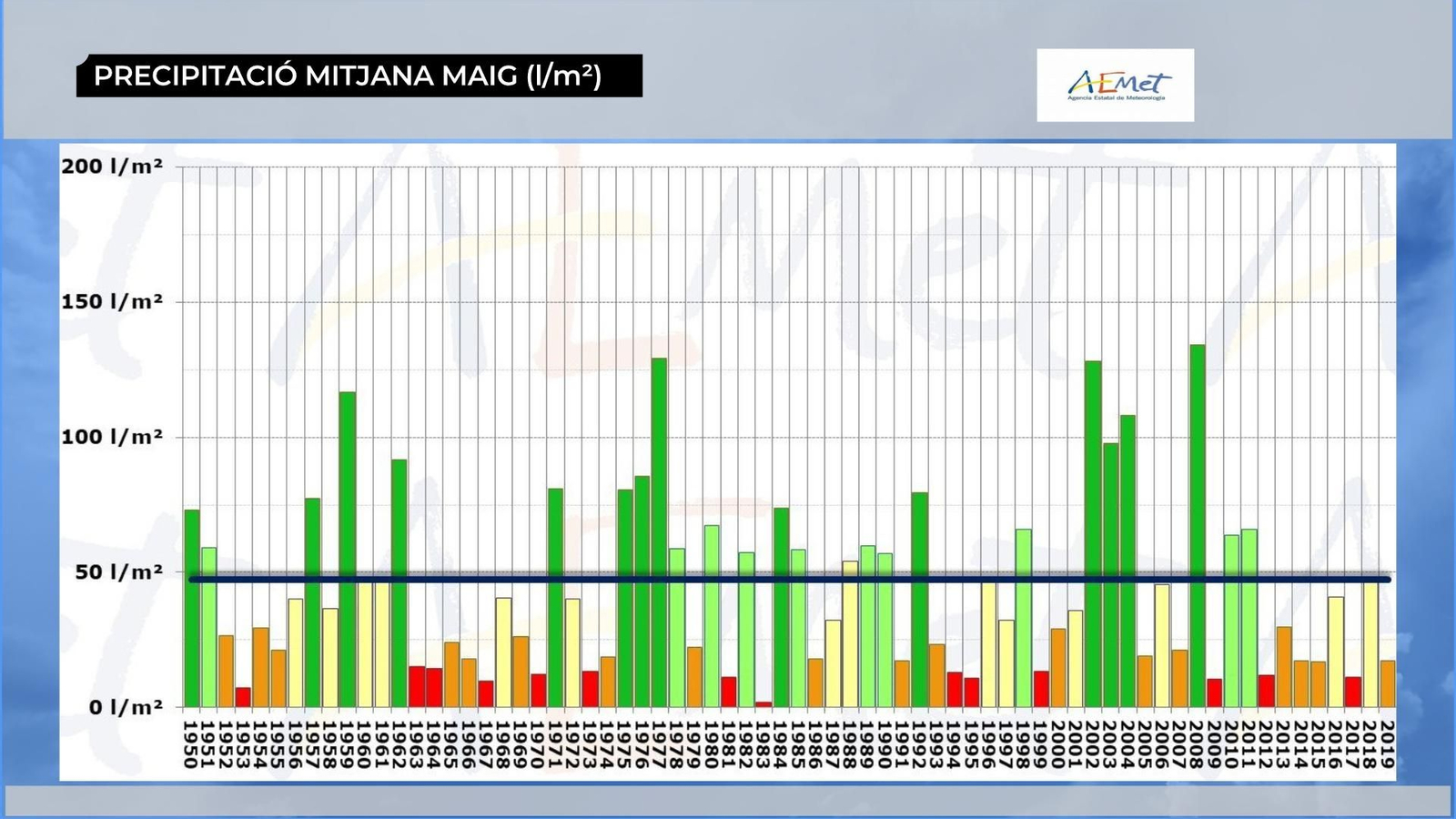 El maig de 2019 ha sigut qualificat com a sec i tèrmicament normal, i la comparativa s’ha fet amb la mitjana estimada en el període de 30 anys, de 1981 a 2010.