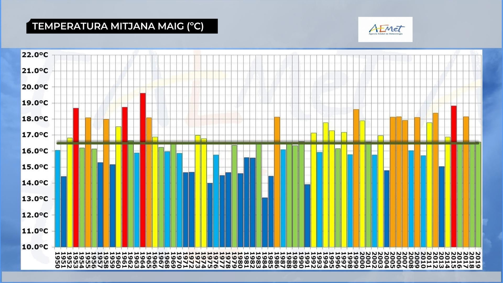La temperatura mitjana del mes de maig del 2019 ha sigut de 16.6 °C, i s’ha quedat 0,1 °C per damunt de la de referència (16,5 °C). Per tant, és un maig tèrmicament normal. I es que, en conjunt, durant aquest mes que acabem de deixar arrere, les temperatures van estar molt pròximes o fins i tot per davall de la temperatura mitjana de referència, exceptuant les que es van registrar el 10 de maig, quan les màximes de moltes localitats centrals i del litoral van superar els 30 ºC. Sagunt, en concret, va registrar una màxima de 34,7 ºC, la més elevada d’aquest dia i des que va començar l’any a Espanya en la xarxa d’estacions meteorològiques d’Aemet. València, Xàtiva o Carcaixent registraren també màximes per damunt dels 32 ºC. Ací, l’efecte de les brises, com a la resta de zones centrals, va tardar a arribar.